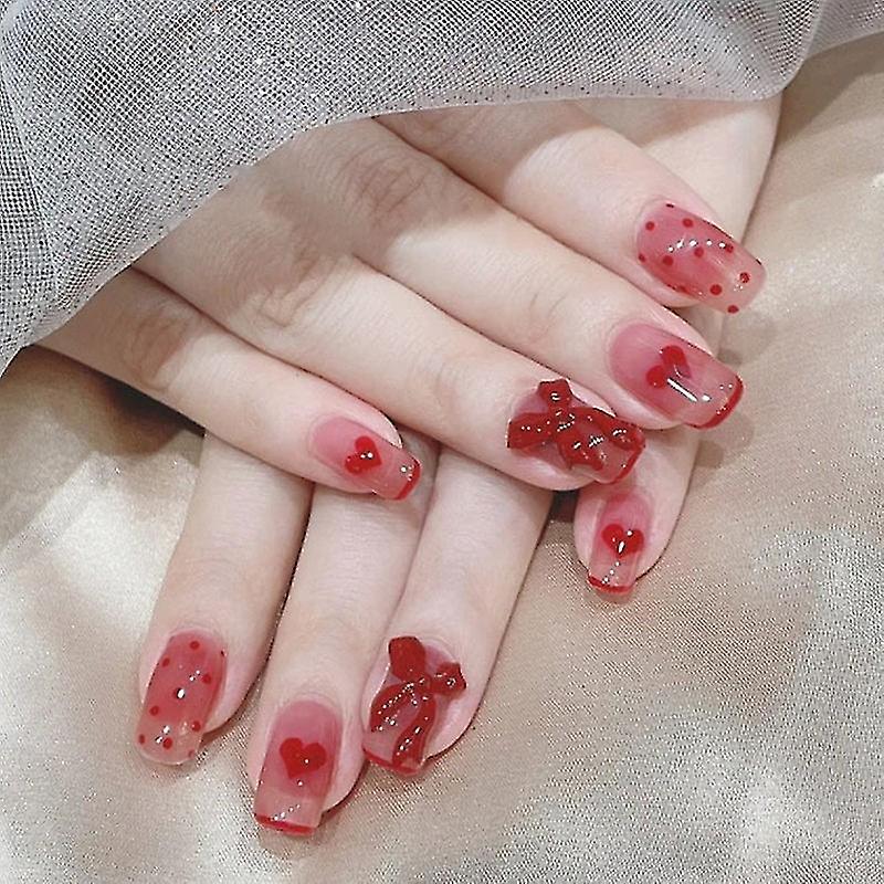 24pcs Red Bow Nail Patch Sweet Style Glue Type Removable Short Paragraph Manicure Save Time