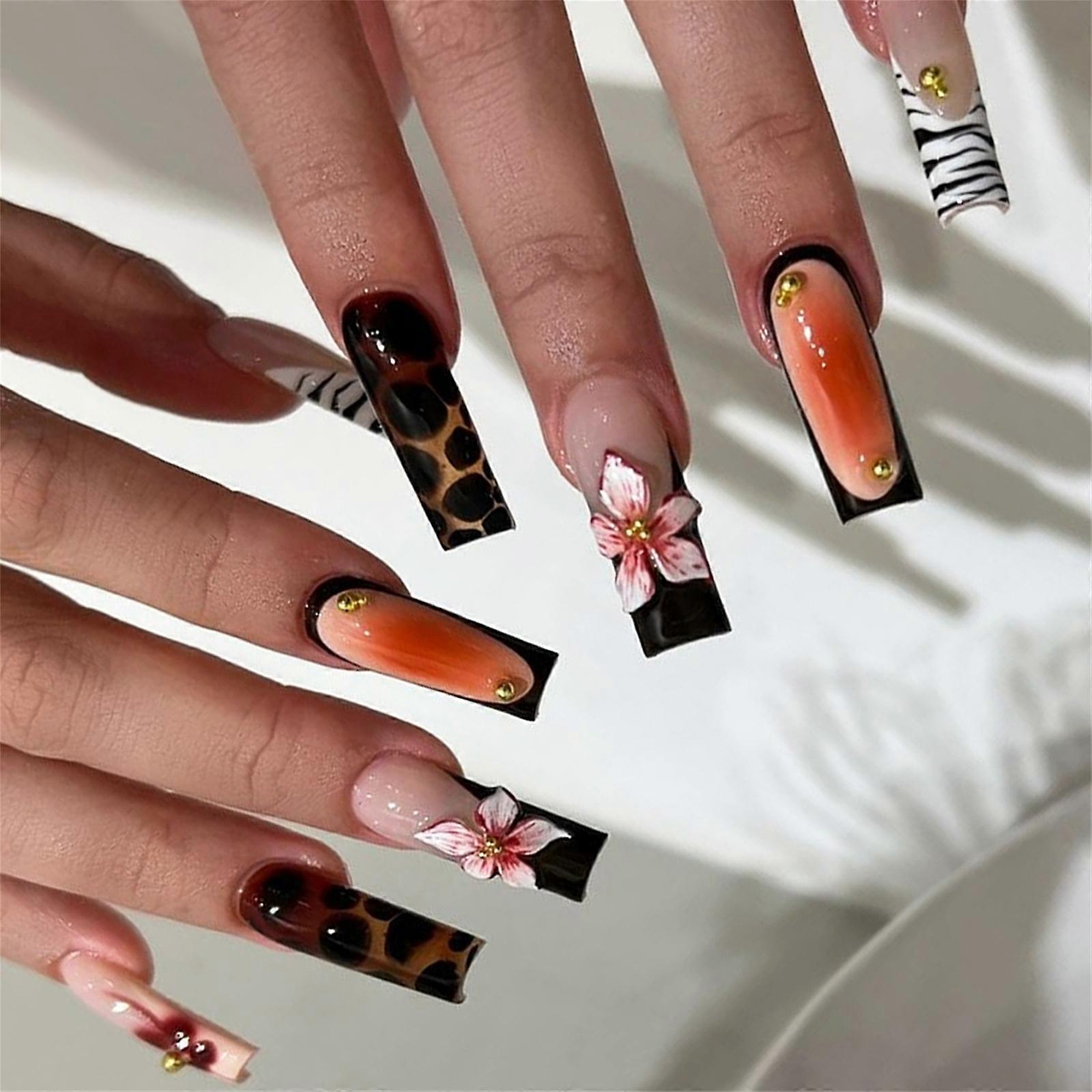 24pcs Long Square Press on Nail False Nail Floral French Leopard Acrylic Stick on Nail Set For Parties And Daily Wear