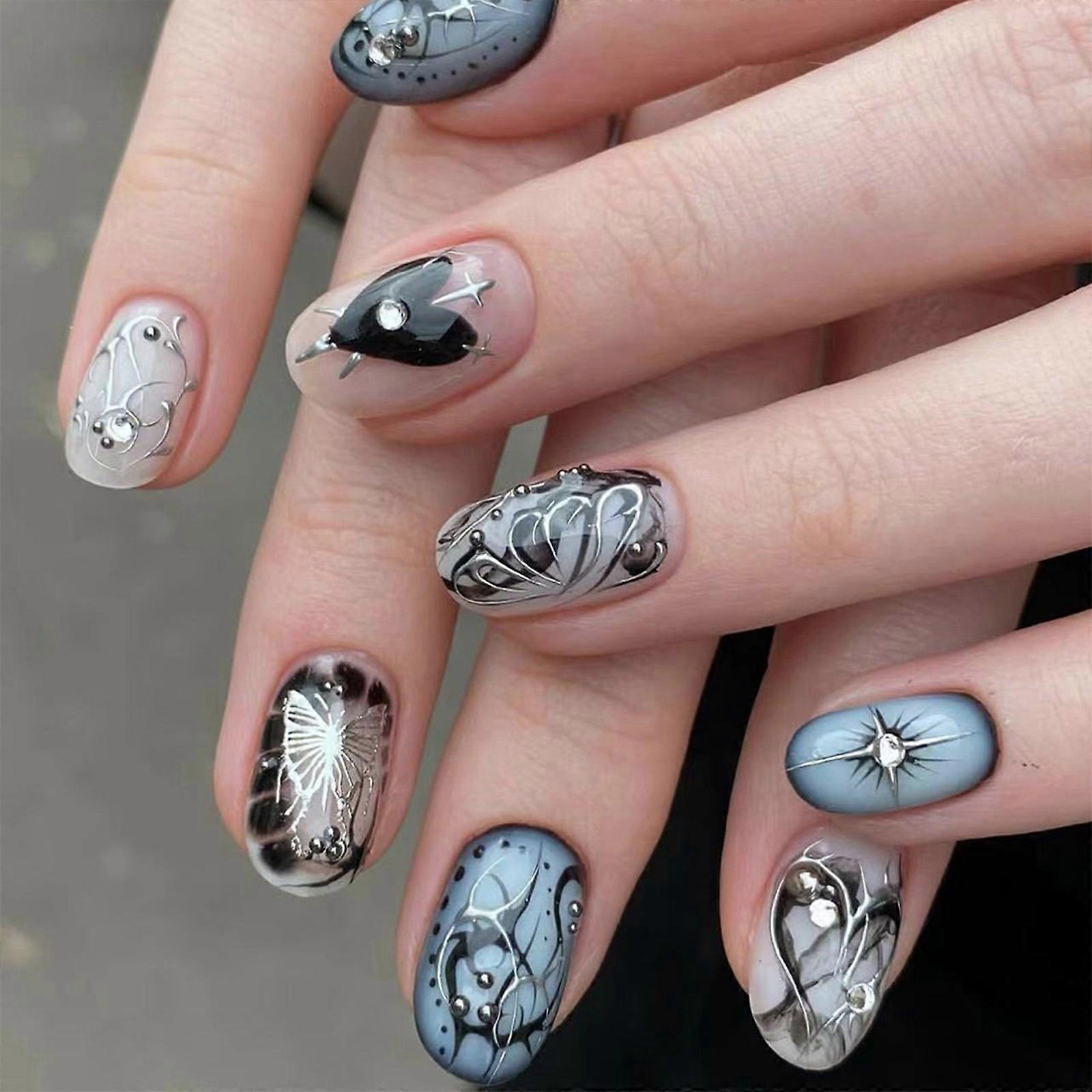 24x 3D Rhinestones Full Cover False Nail Press On Nail Butterfly Stick on Nail Silver Black Lines Acrylic Nail