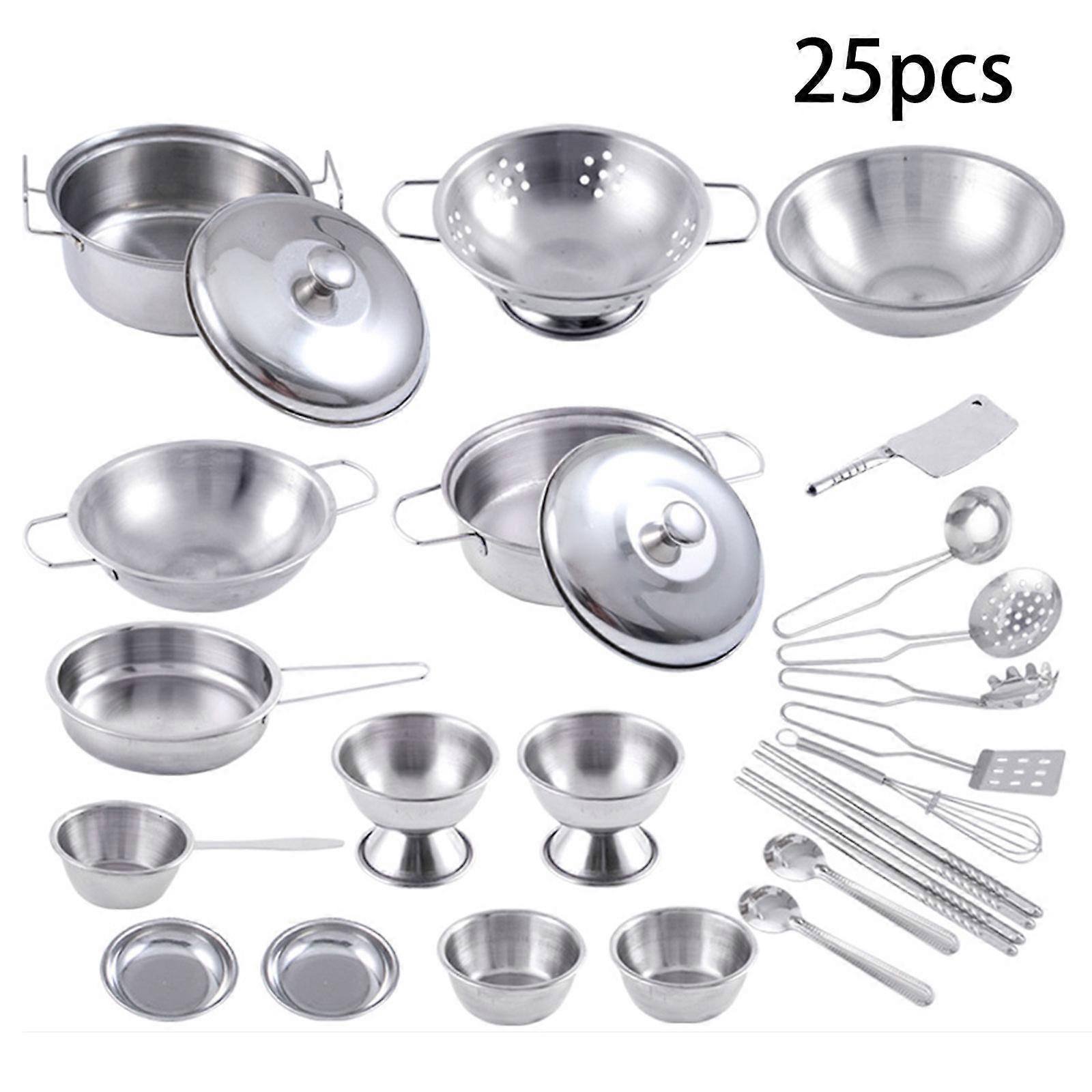 25Pcs Stainless Steel Cooking Playset Kids House Kitchen Toys Children Pretend for Play Cookware