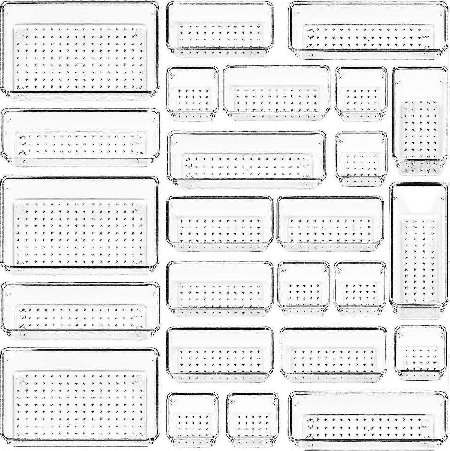 25 PCS Clear Plastic Drawer Organizers Set, 4-Size Versatile Bathroom and Vanity Drawer Organizer Trays, Storage Bins for Makeup, Jewelries, Kitc