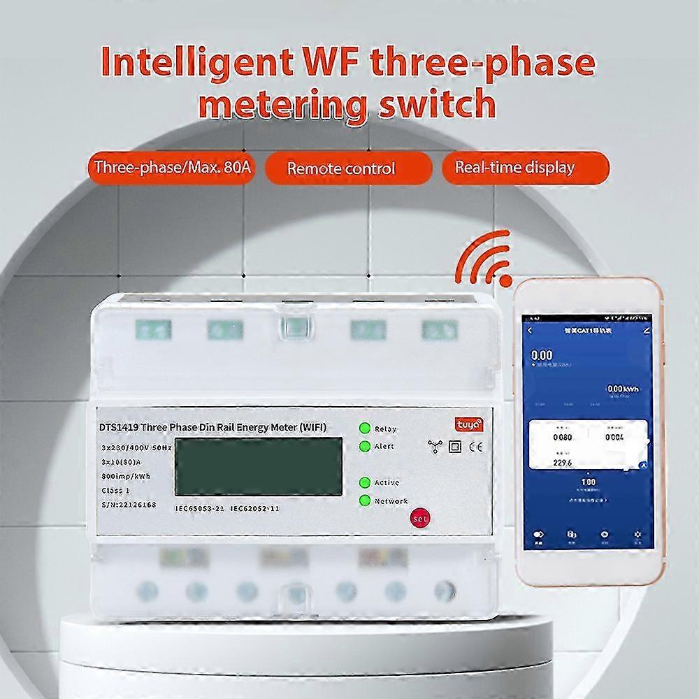 Smart Electricity Meter WIFI Remote Prepaid Electricity Meter Multifunctional 3-phase Rail Type Home Room Rlectricity Meter LCD Screen for Tuya App Electricity Management Digital Energy Meter Features: 【Easy Device Setup】: The Tuya Smart Electricity Meter features a convenient device pairing process, allowing for seamless connection to your home network. Simply power on the meter and use the Tuya Smartphone app to scan and connect. No complicated setup required. 【Remote Control and Management】: With the Tuya Smartphone app, you can easily control various functions of the electric meter from your phone. From remotely turning on and off the electricity supply, managing prepaid usage, setting timers, to receiving notifications and alerts, you have full control over your energy consumption. 【Accurate Measurement and Monitoring】: The Tuya Smart Electricity Meter provides real-time measurements of total power consumption, voltage, current, power, and available electricity. Stay informed about your energy usage and track any changes or abnormalities in your electrical system. 【Prepaid Functionality】: Take advantage of the prepaid feature offered by the Tuya Smart Electricity Meter. Set up prepayment options, monitor remaining electricity balance, recharge the meter, view recharge history, and automatically disconnect power supply when the available electricity reaches zero. 【Smart Features and Indicators】: The Tuya Smart Electricity Meter is equipped with advanced features such as customizable alarms for overvoltage, undervoltage, overcurrent, and low balance. Additionally, the meter has LED indicators for active pulse, reactive pulse, power on/off status, and network connection status, providing clear visual feedback on the meter's operation. Specifications: Casing: ABS Anti Flaming material Rated Voltage: 3x230/400V Voltage Range: Un±20% Accuracy: Class 1 Basic Current: 10A Max Current: 80A Impulse constant: 800imp/kWh Frequency: 50Hz or 60Hz Standard: IEC62052-11;IEC62053-21 Certificate: CE Power consumption: 8VA 0.4W per phase Starting current: 0.004b Communication: Tuya WIFI Parameters: UIP KWH Equipment Working Voltage Range: 0.9Un~1.1Un Extreme Working Voltage: 0.7Un~1.3Un Power Consumption of the Whole Machine: ≤ 1W, 6VA Display Resolution of Cumulative Positive Active Power: 0.1kWh Display Resolution of Cumulative Reverse Active Power: 0.1kWh Display Resolution of Cumulative Positive Reactive Power: 0.1kWh Display Resolution of Accumulated Reverse Reactive Power: 0.1kWh Voltage Display Resolution: 0.1V Current Display Resolution: 0.001A Power Display Resolution: 0.001KW Note: Due to the different display screen and light effect, the actual color of the item might be slightly different from the color showed on the pictures. Packing List: 1 x Smart Electricity Meter 1 x Instructions