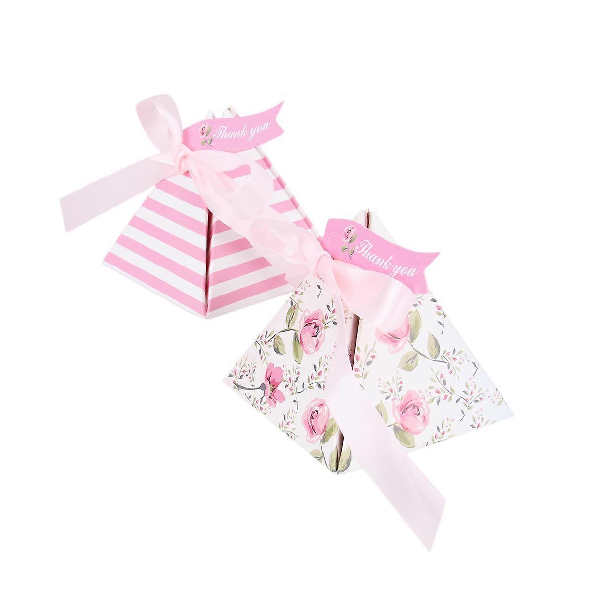 25pcs Triangle Wedding Candy Box Creative Beautiful Double-Sided Printing Storage Box for Wedding Party Festival (Pink, With Ribbons and Cards)