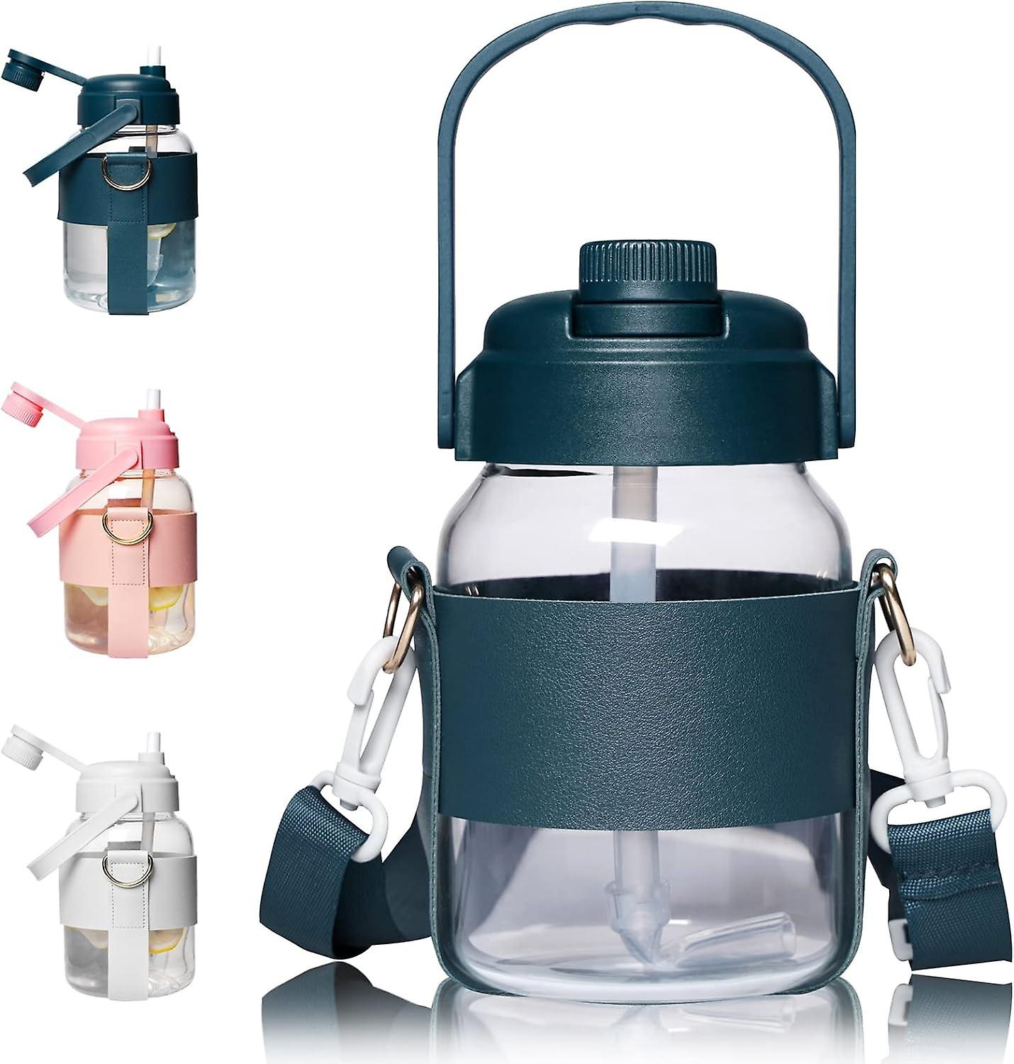 About this item Material Design: These 26/32/42/54oz capacity glass water bottles are made of glass, bpa free & dishwasher safe, comes with a detachable straw, detachable strap, screw cap lid with detachable handle, detachable & adjustable leather sleeve Functional Details:To make these cute clear glass water bottles with straw easy to carry, we equipped it with a leather sleeve which can tightly hold the body of bottle and a detachable strap. To make washing and adding ices & fruits easier, we designed this water jug mouth to be 3” wide. To let you pick your own way of drinking and solve the problems of leaking and splashing, we have also added a knob cap, a leakproof cap covering the whole bottle mouth and a detachable straw Suitable Occasions:These aesthetic kawaii water bottles can not only be used at home in daily, but also can be taken to work solving problem of not drinking enough water since the maximum capacity of these water bottles is 54oz-1600ml. And this wide mouth water jug can be taken to outdoor, school, travel, picnic and so on as a motivational water bottle. We hope this gaint aesthetic sports water bottles can accompany you to everywhere you want to go Package Contains: Glass water bottle*1, detachable straw *1, bottle cover *1 with knob cap, detachable handle*1,