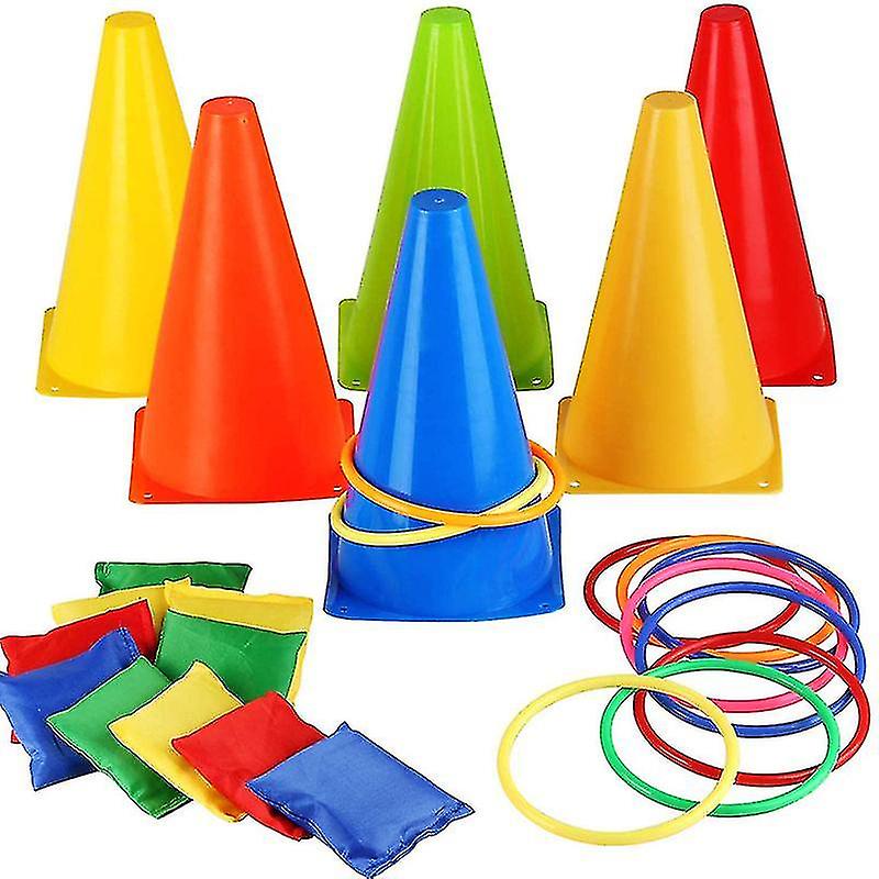 Product Description: Size: multicolored cones:13.5cm*23*cm bean bags:5cm*5cm colored plastic rings:15cm Material: plastic. Feature: 1.Seems sturdy and many different games can be played. 2.Suitable forbirthday partyindoor or outdoor gameCarnival partyconstruction partycar's party. 3.Fun for the whole family: children can spark fun and creative connections with one another while enjoying essential hours of exciting playtime with friends and family. Package Including: 6pcs Multicolored cones; 10pcs Bean bags; 10pcs plastic rings.