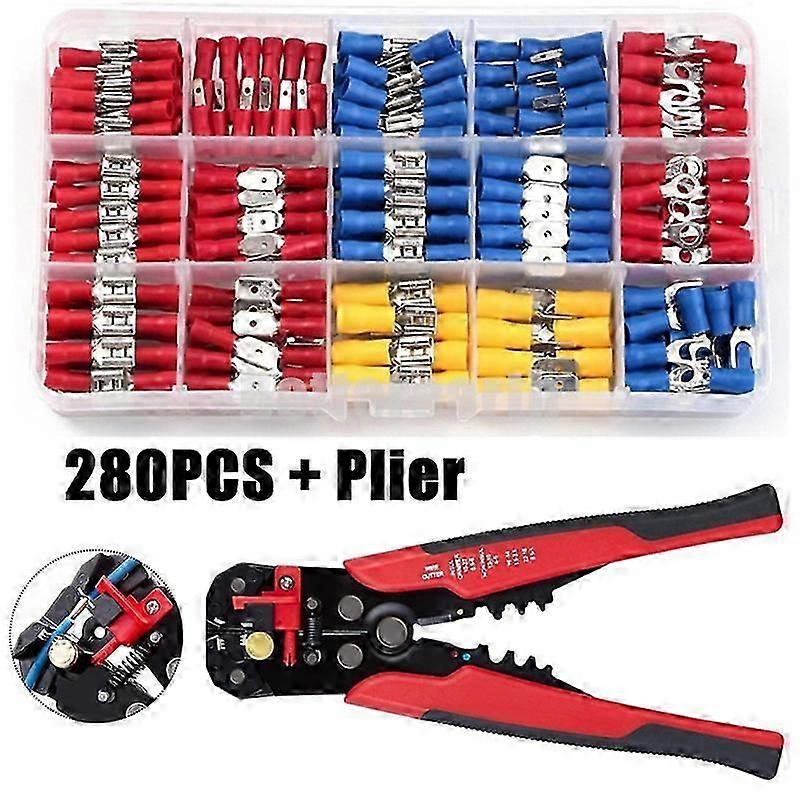 280PCS Spade Terminals Insulated Cable Connector Electrical Wire Crimp Butt Ring Fork Set Ring Lugs + Wire Stripper Plier
