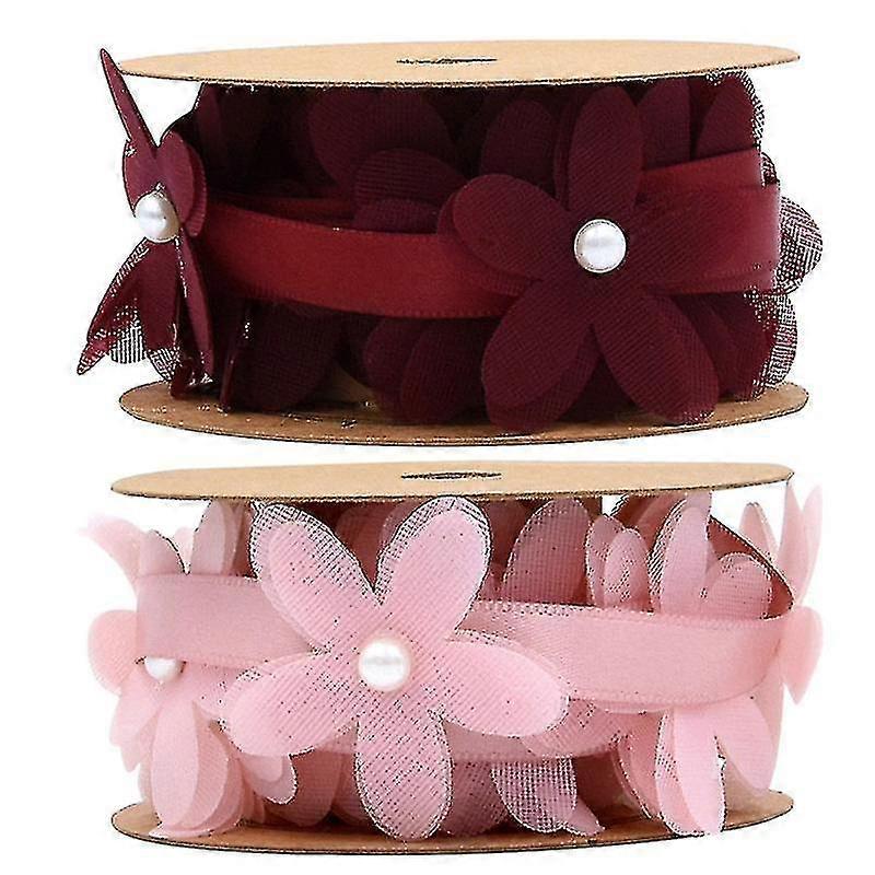 2 Roll Of 2m Creative Flower Lace Ribbon Cloth Fabric Garland Ribbon Band Gift Wrapping Supplies For Wedding Diy Craft (claret, Pink Style)