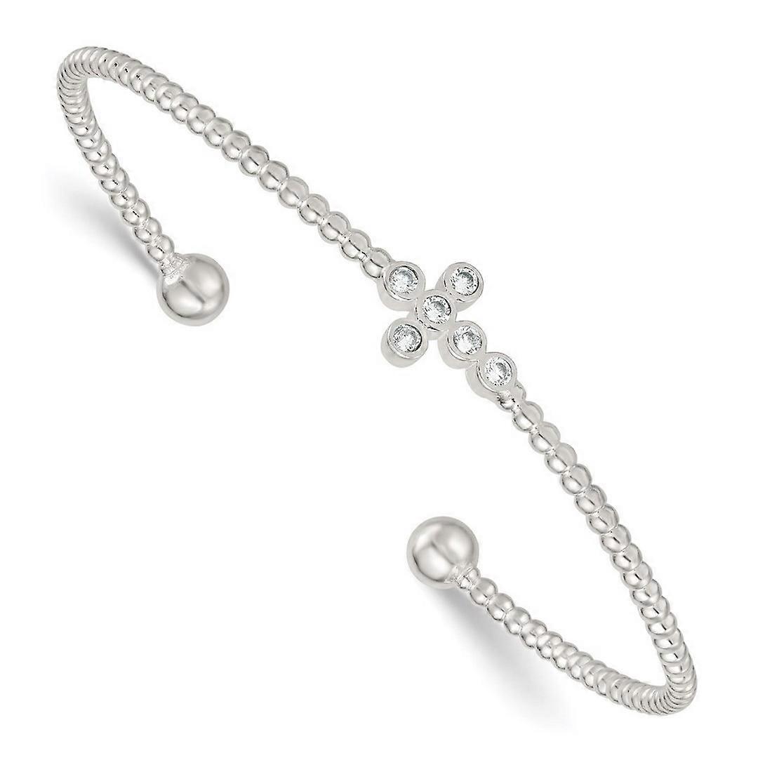2mm 925 Sterling Silver Polished and Beaded Cubic Zirconia Religious Faith Cross Cuff Stackable Bangle Bracelet-Cuff-Bra