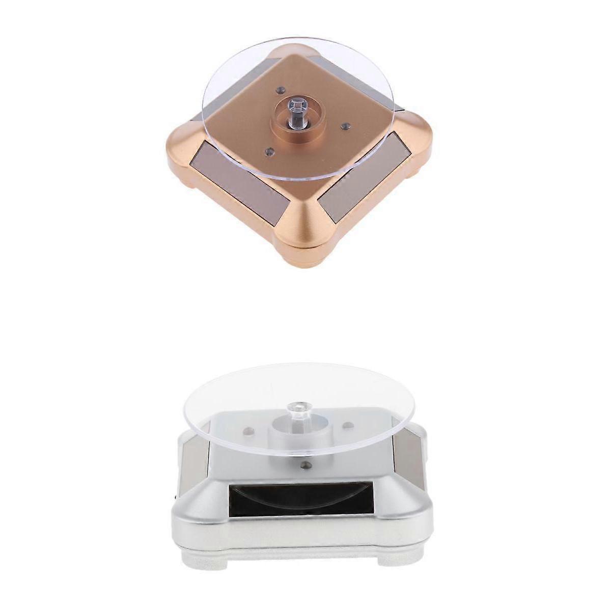 Description: Mute and 360° circumvolution, color changing lights perfectly helps catch customer's eyes Rotates well under natural light/ indoor light; also can be equipped with 1 piece AA battery( not included) to enhance power Low power consumption, environmental friendly For displaying products such as phones, small cases/covers, watches, jewelries. etc Widely used in supermarkets, retailing stores, exhibitions, even personal DIY for advertising and displaying purposes Specification: Vertical load: 300-500 grams Solar panel light intensity: illuminance ≥ 260 (general fluorescent light is enough) Rotating direction: 360° clockwise or counterclockwise Speed: 3-5 rpm Applicable to the display of molds, mobile phones, cameras, watches, jewelry, digital products, robots and other products. Basic Power supply: sunlight Additional Power supply: 1x AA battery Color: Gold/ Silver Package Includes: 2 Pieces Solar Powered Display Stands ( 1x Gold + 1x Silver) Note: Please allow 1-5mm inaccuracy due to manual measurement. Thanks.