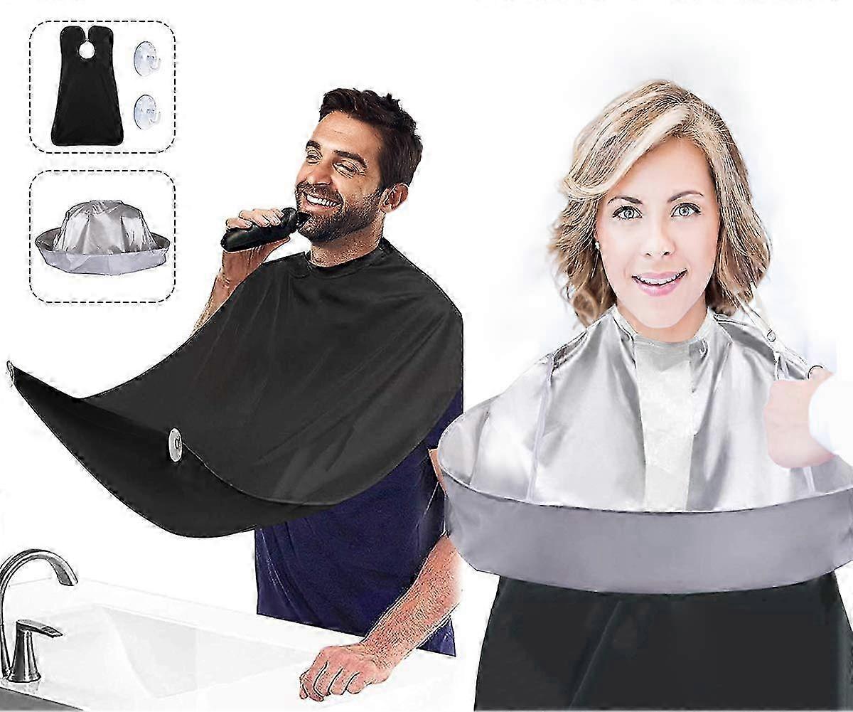 【Family Set】Our set includes one barber cape and one beard cape with 2 suction cups. Suitable for home use, adults men and women, the elderly, children haircut, men's shaving and women's bangs trimming.^ 【High Quality Material】Our hair cape for haircut and beard apron set is make of high quality nylon, soft and skin friendly, waterproof and antistatic, comfortable to use, lightweight and portable.^ 【For All Size】Both cloak to haircut and beard catcher have velcro. Just adjust the velcro to the neck size so that it can fits the neckline perfectly aviod the beard and hair penetrate.^ 【Cleanable Foldable Storage】Can be folded into a very small size, easy to store. Washable and dry quickly, durable in use, not suitable for washing machines.^ 【Easy to Use】Our stylist cape is umbrella design, The shaving bib can be held up by hooks, both make it perfect for catching stray beard and hair. Keep clothes and floor clean. Suitable for hairdresser, hair dye, perm and cutting as well as for the entire salon project.^