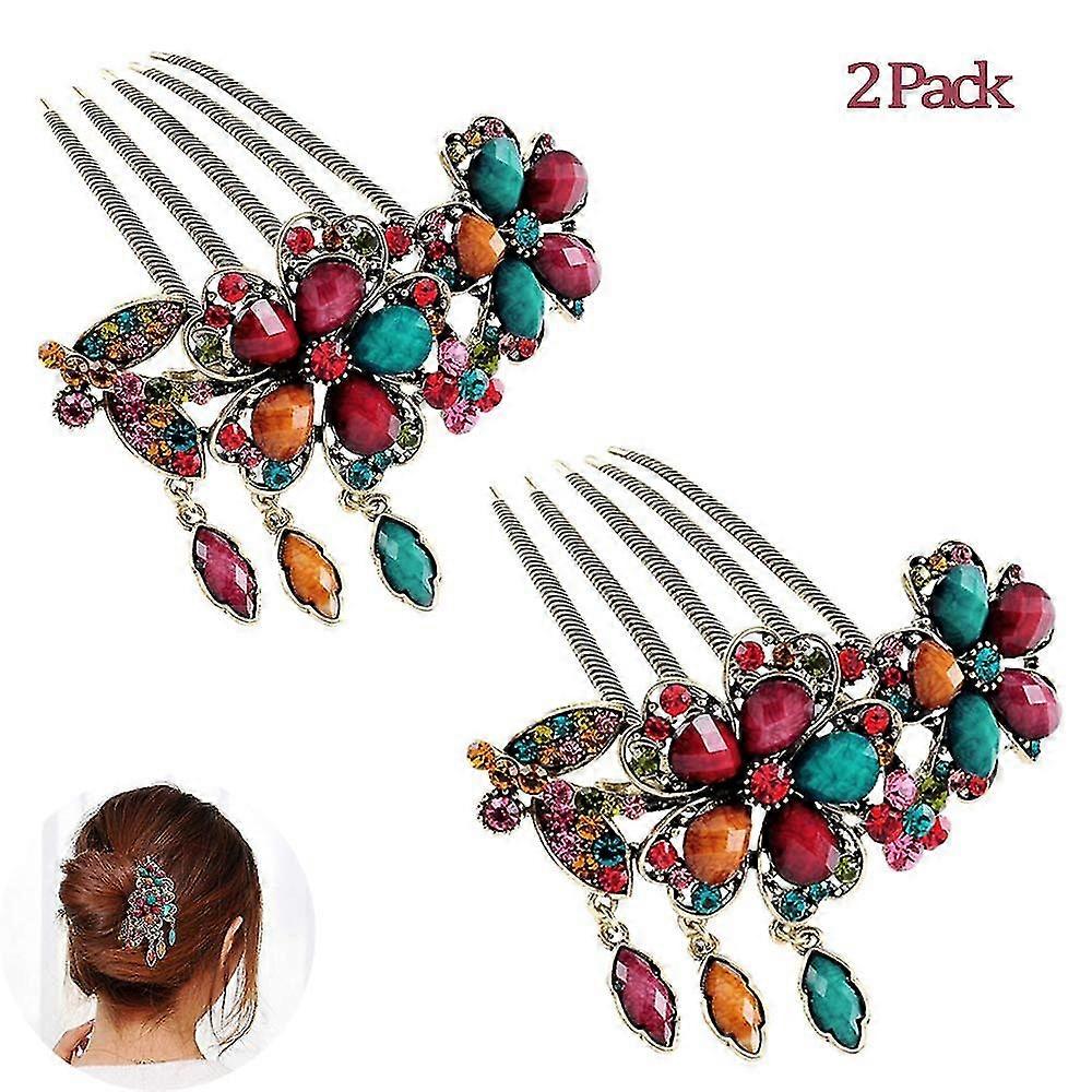 2pcs Women Hair Combs Accessories, Retro Decorative Hair Comb Clips - Rhinestone Flower Hairpin For Wedding Prom (2 Colorful)
