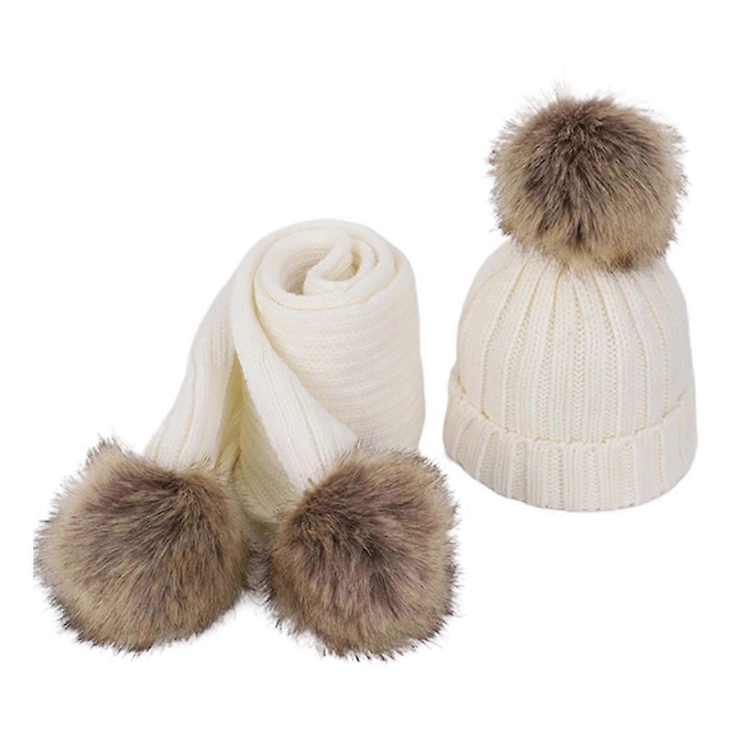 2pcs Children Knitted Beanie Hat Scarf Set Cute Infant Baby Fake Ball Pom Pom Cap Warm Winter Beanies for 3-8 Years Old White