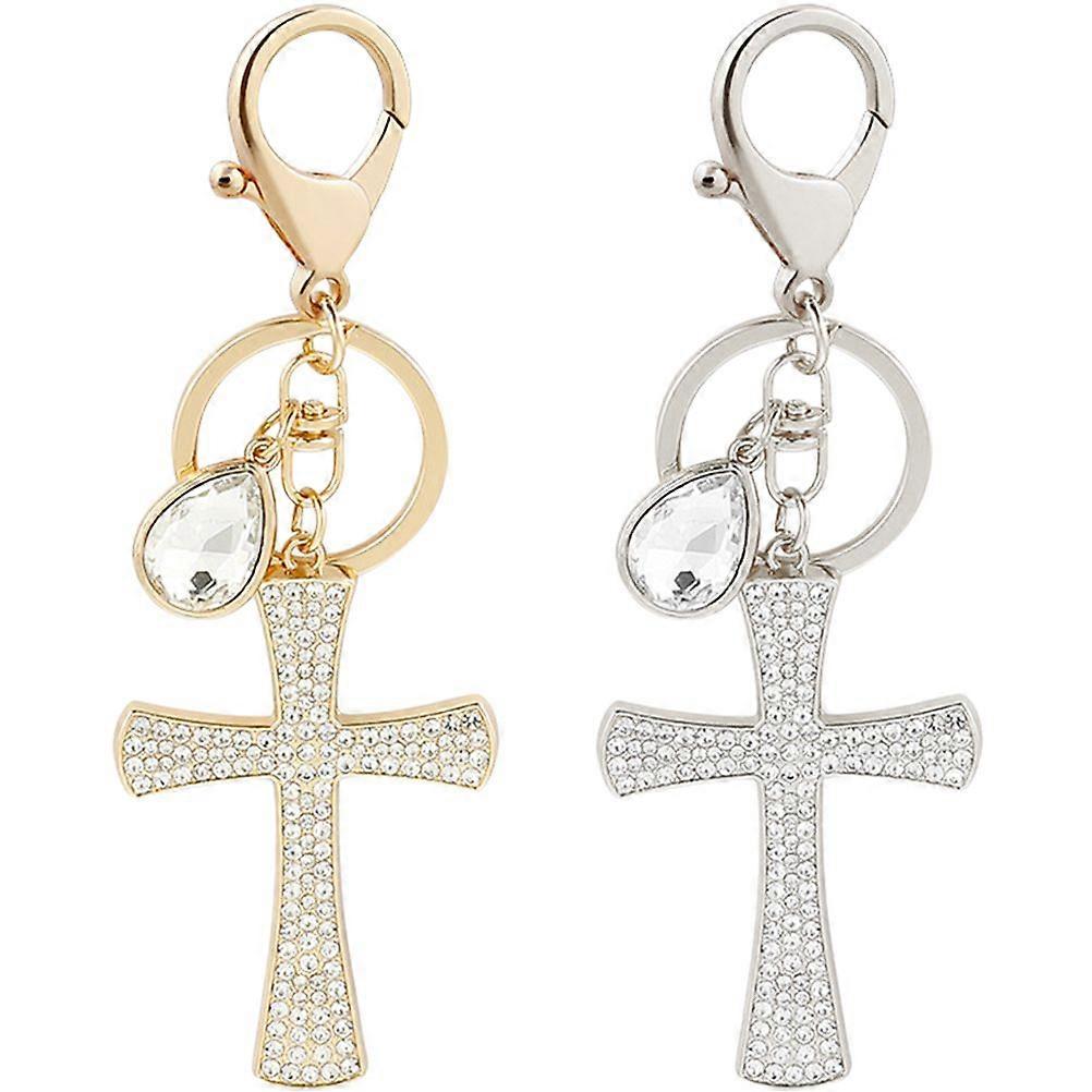 2pcs Exquisite Alloy Cross Pendant Shiny Rhinestone Decoration Key Chain European Style Key Ring