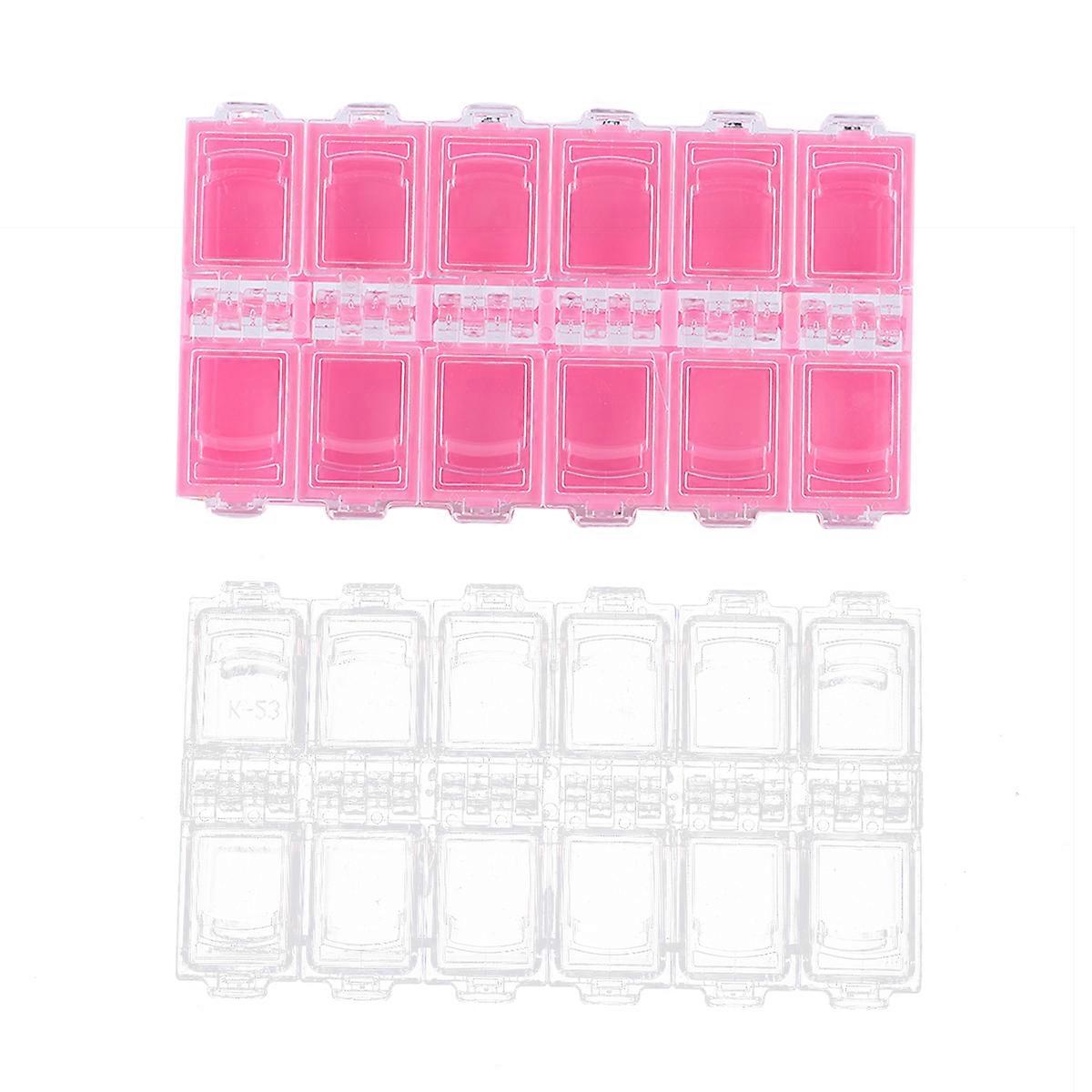2pcs 12-Grid Storage Box Fake Nail Piece Storage Case Nail Art Supplies Storage Container for Home Daily Use (Pink + Transparent)