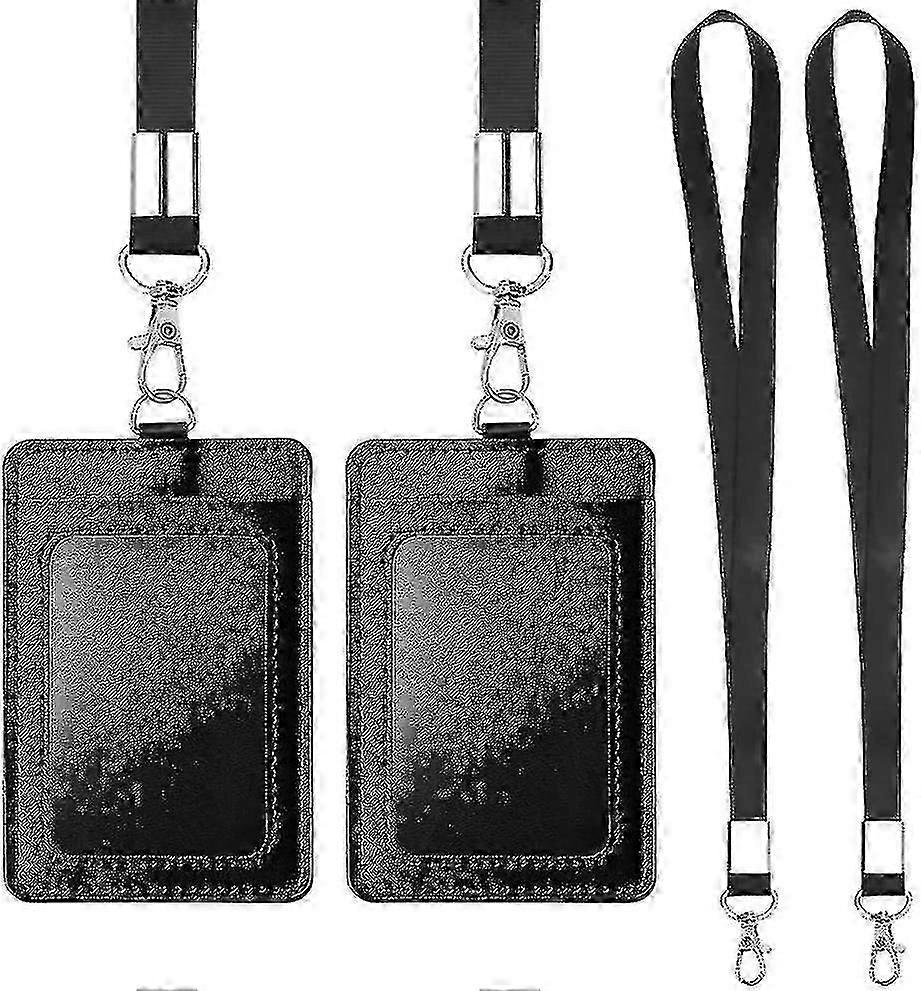 2pcs Vertical Pu Leather Id Badge Holders with Clear Window & Detachable Neck Lanyard - Black