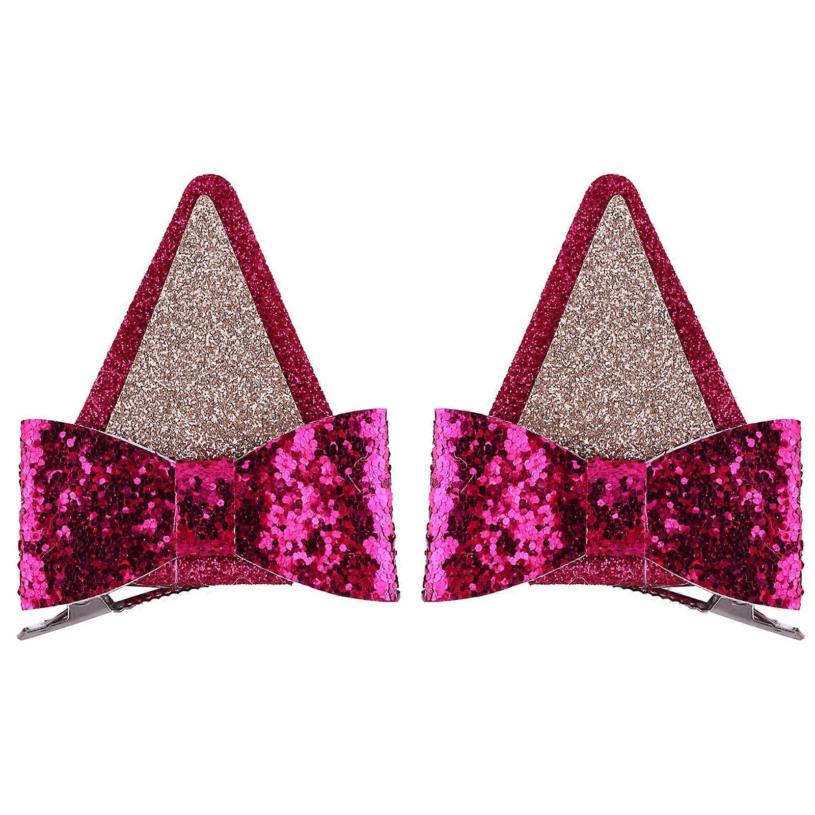 2x Get-ready-to-shine! Girls Barrettes Cat Ears Animal Ears Hair Clip Set with Shinning Glitter Versatile Barrettes rose Red