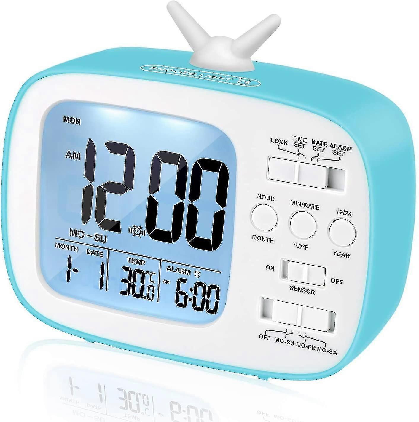 Product Features:An ideal Gift This is an uniquely designed alarm clock (replicates a retro-style TV), a nice gift for both girls and boys. A perfect decorative item for the bedroom, office, study room, and kitchen etc. This is an ideal gift for birthdays, Halloween, Christmas and other occasions.No more TickingDisturbed by the ticking? Considering replacing your old alarm clock? Our Twin Bell Alarm Clock is 100% NO-TICKING.Compact and PortableThe traditional retro style takes you back to the 80's. This alarm clock is the perfect accessory for your room. With its sleek design, this clock takes very little space. Its a great choice as a gift for different occasions.Adjustable Brightness at Night This product features a light sensor which automatically changes the brightness on the display screen according to the environment. All you need to do is switching the sensor button.Battery Operated Clock with Multiple SettingsThis Alarm Clock has multiple settings for different schedules, including work/school days, weekends etc., and its EASY to set 3 AA batteries are required.Specifications:Parcel Dimensions 13.4 x 11.8 x 5.8 cm; 180 GramsShape RectangularAre batteries included? NoMounting type FreestandingAlarm clock YesNOTE1. Please allowed 1-3mm differences due to manual measurement, thank you for your understanding2. Due to the difference between different monitors, please understand that the picture may not reflect the actual color of the item.Customer Satisfaction:24-hour response time,30 day refund guarantee,12 months guarantee.If there is any problem, please feel free to contact us.