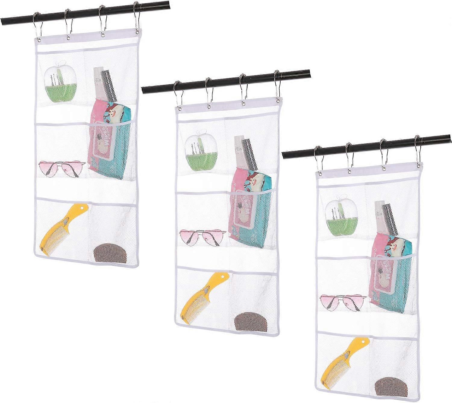 3 Pack Hanging Mesh Shower Caddy Organizer with 6 Pockets, Shower Curtain Rod/Liner Hook Fabric Storage Ba