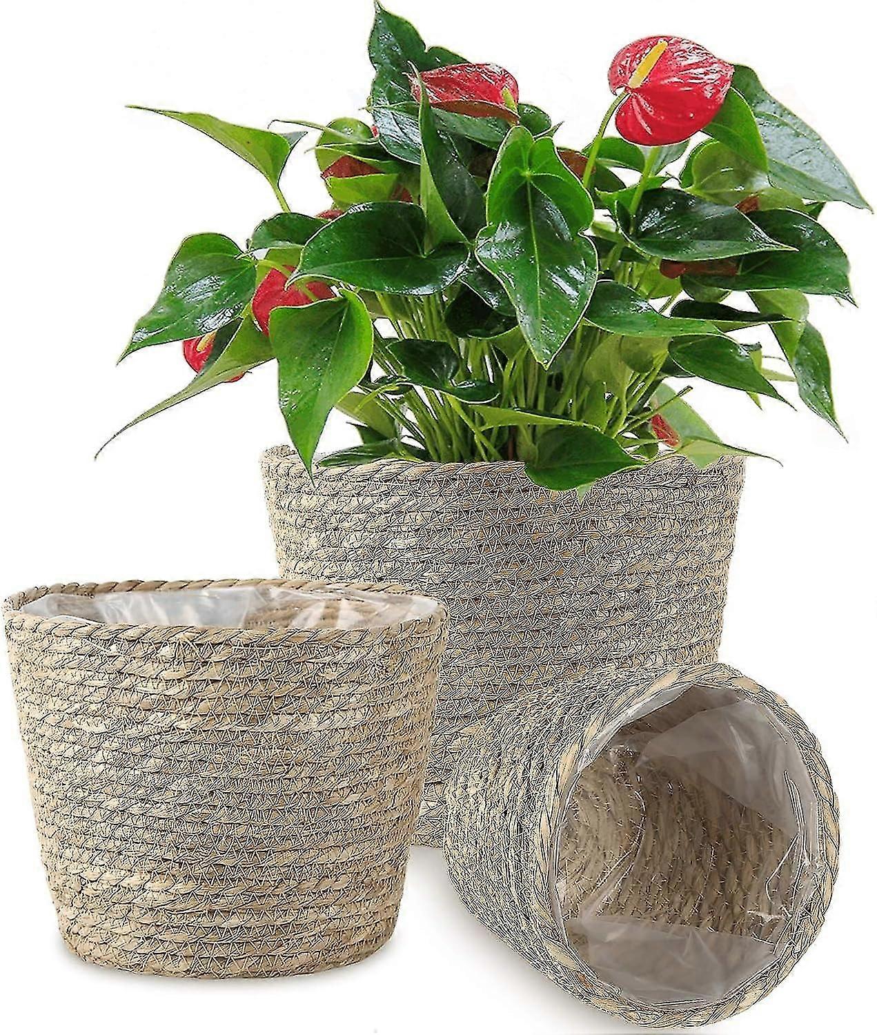 3 Pack Seagrass Baskets Hand Woven Planters Waterproof Plastic Liner Storage Organizer