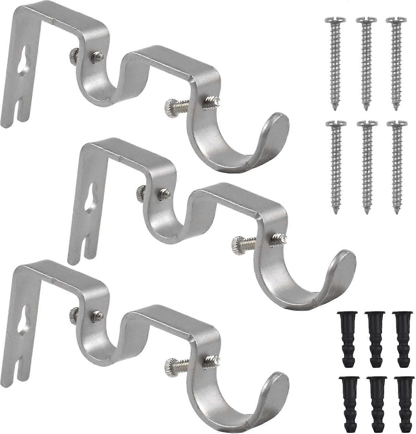 3 Pieces Double Curtain Rod Brackets, Heavy Duty Wall Mount Curtain Rod Bracket Metal Hooks with Screws - Silver
