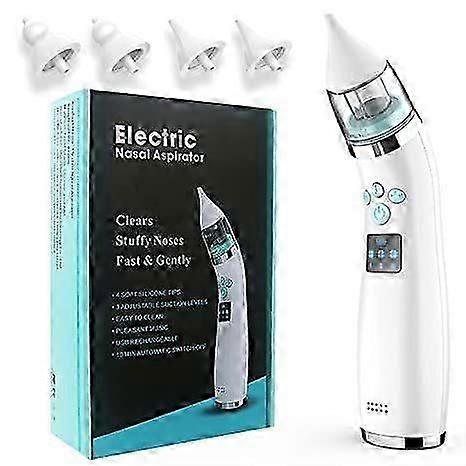 HYGIENIC EASY TO CLEANBaby nasal aspirator is accord medically tested suction standards to avoid damage baby's delicate nasal mucosa, mouth contact, and crossinfection. And also this snot sucker for baby is equipped with Four independent and reusable silicone tips attached will also be the assurance of absolute cleaning. Enough for your baby's daily use.STREAMLINE DESIGNBaby electric nose cleaner is ergonomic design, zero screw exposure, controlled by the simple push of a button allowing for one handed use.Mom can hug the kids with one hand and use this baby nasal aspirator to Sucker snot for baby. It is lightweight and The baby nose suction can fit small purses and bags with its small dimensions.SOOTHING MUSIC USB RECHARGEABLEElectric Nose Sucker for Newborn baby with cheerful children's music which can comfort babies who may experience anxiety with electric objects. Rechargeable and portable baby nose sucker comes with builtin 400mAh battery. Attention: It will not work while charging.THREE LEVELS OF SUCTIONBaby nose sucker for baby comes with 4pcs hygienic nasal suction heads of two different sizes for babies of different ages and conditions. Electric nose cleaner has three adjustable suction levels to adapt to the needs of different situations. Strong suction easily help you to solve all forms of snot.YOU Will RECEIVE 9PCS ITEMExquisite packaging box including baby nasal aspirator*1, snot collect cup*1, tweezers*1, USB cable*1, groundtype silicone tips*2, funneltype silicone tips*2, user manual*1.