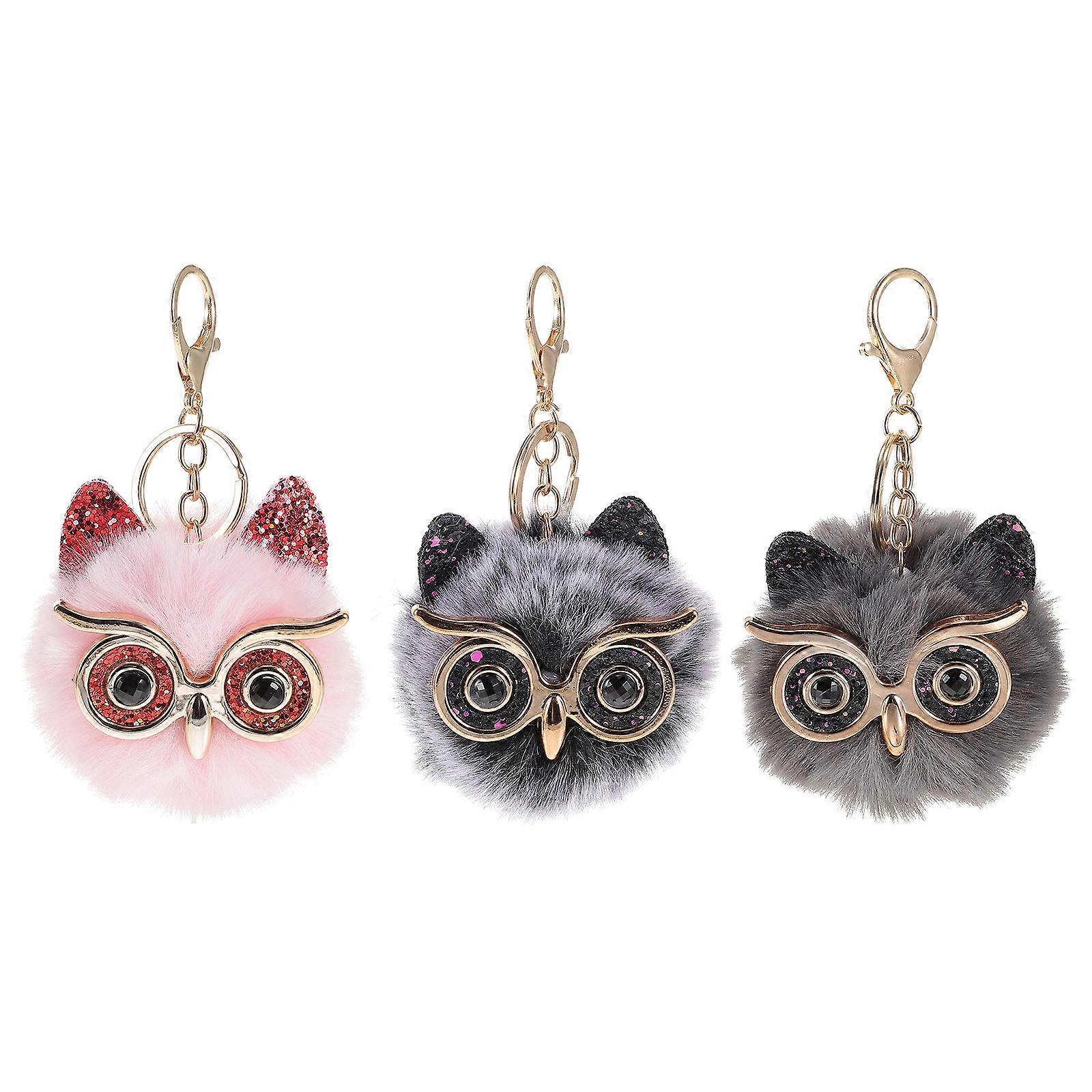 3pcs Owl Shaped Furry Hairball Keychain Cute Keyring Pendants for Bags and Keys Decoration Adorable Accessories Grey