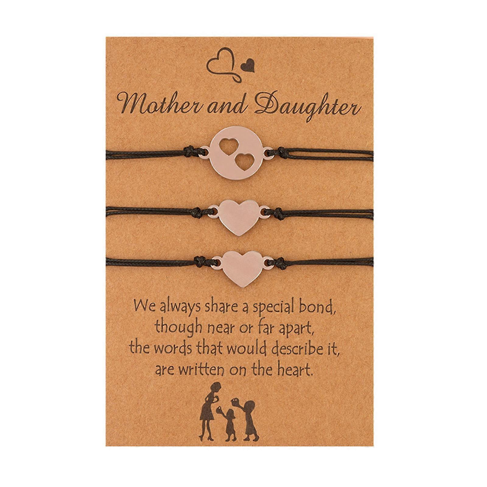 Features: Mother Daughter Card Bracelet: Wearing it on the wrist, represents no matter wherever we go, no matter what we do, we for always share a special bond. Adjustable Size: Suitable for most mother and daughter wrists, the wax cord is smooth, strong, flexible, 16-30 for cm/6.29-11.for 81 inch adjustable, and it is also a waterproof wrist strap. Meaningful Design: You will get 3 matching heart-shaped bracelets with for wish cards, lovely heart-shaped bracelets represent that you and your mother and sisters will for always be connected and never separated. Great Gift for Mother and Daughter: It is an excellent gift for Mother's Day. Give them a surprise on Mother's Day or birthday. Your mother or your daughter will be very happy and moved. Premium Material: Made of quality stainless steel, braided rope and paper material, lightweight, fashionable, durable, elegant and comfortable to wear, which is easy to adjust and will not fall apart. Specifications: Material: Stainless Steel + Braided Rope + Paper Size: Approx. 16-30 for cm/6.29-11.for 81 inch, Adjutable Style: European and American, Simple, for Creative, Individual Quantity: 3 Pcs/set Note: Please allow 1-2cm errors due to manual measurement,pls make sure that you do not mind before you order. Due to the difference between different monitors, the picture may not reflect the actual color of the item. Package includes: 3 Pcs/set Mother Daughter Card Bracelets