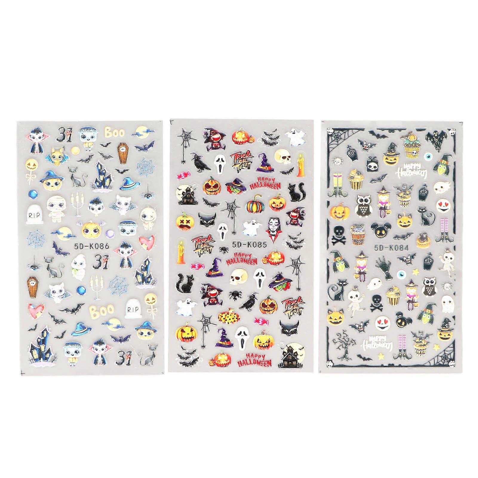 3-sheets Halloween Embossed Nail Art Sticker Self-Adhesive Skull Ghost Pumpkin Pattern 5D Nail Decals