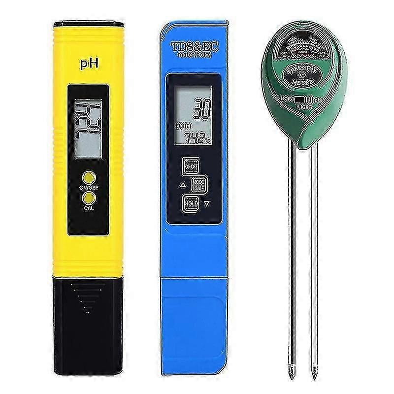 TDS meter: 3-in-1 TDS EC and Temperature Meter 3-in-1 Professional TDS Meter is very useful if you want to know how clean your water really is,and it is a professional water test meter that fits in your pocket. This Accurate and Reliable Meter perfect for all water quality testing, water purification applications, waste water regulation, aqua culture,hydroponics, laboratory and scientific testing, pools & spas, ecology testing, silver, water treatment and more. A suitable soil environment is important for the healthy growth of plants. This means providing perfect soil conditions, adequate water, sunlight and plenty of nutrients for your plants. tester helps you know your soil more clearly and care your plants better. It will help you to avoid some of the common mistakes made by such as over or under watering and planting in an area with insufficient lighting and even highlight potential issues with soil that is too alkaline or acidic. PH Meter: How to use? Step 1: Remove the protective cap : Clean the electrode in distilled water and dry it Step 3: Turn the meter on by pressing the ON/OFF key Step 4: Immerse the pH meter electrode in the solution to be tested Step 5: Stir gently and wait for the display stabilizes Step 6: After finished, clean the electrode in distilled water and turn the meter off by pressing the ON/OFF key Product Features: Measure Range : 0.00 - 14.00 pH Resolution : 0.01 pH Accuracy : 0.05 pH Calibration: Two Points Automatic Calibration Button Power Supply: 2 x 1.5V LR44 Button Batteries Weight: 50 g Degrees Celsius: 0.1-80.0 Conductivity: 0-9990us/cm TDS: 0-9990ppm Accuracy: 2% Battery: 1 x 3V CR2032 (included) Size: 154x30x14(mm) Material:ABS colour:Yellow+blue+green Package Contents: 1 x PH Meter(yellow) 1 x TDS & EC Meter (blue) 1 x soil tester kit (green) Only the above package content, other products are not included. Note: Light and different displays may cause the color of the item in the picture a little different from the real thing. The measurement allowed error is +/- 1-3cm.