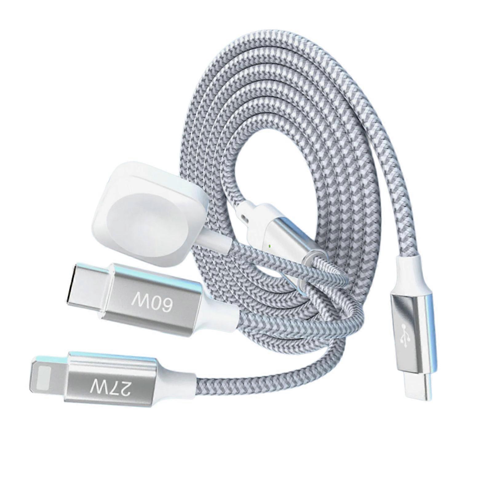 3 in 1 PD27W+60W Charging Cable with Wireless Charger Flashing Cable Adapter Long Cable Charger for Phone & Watch Silver