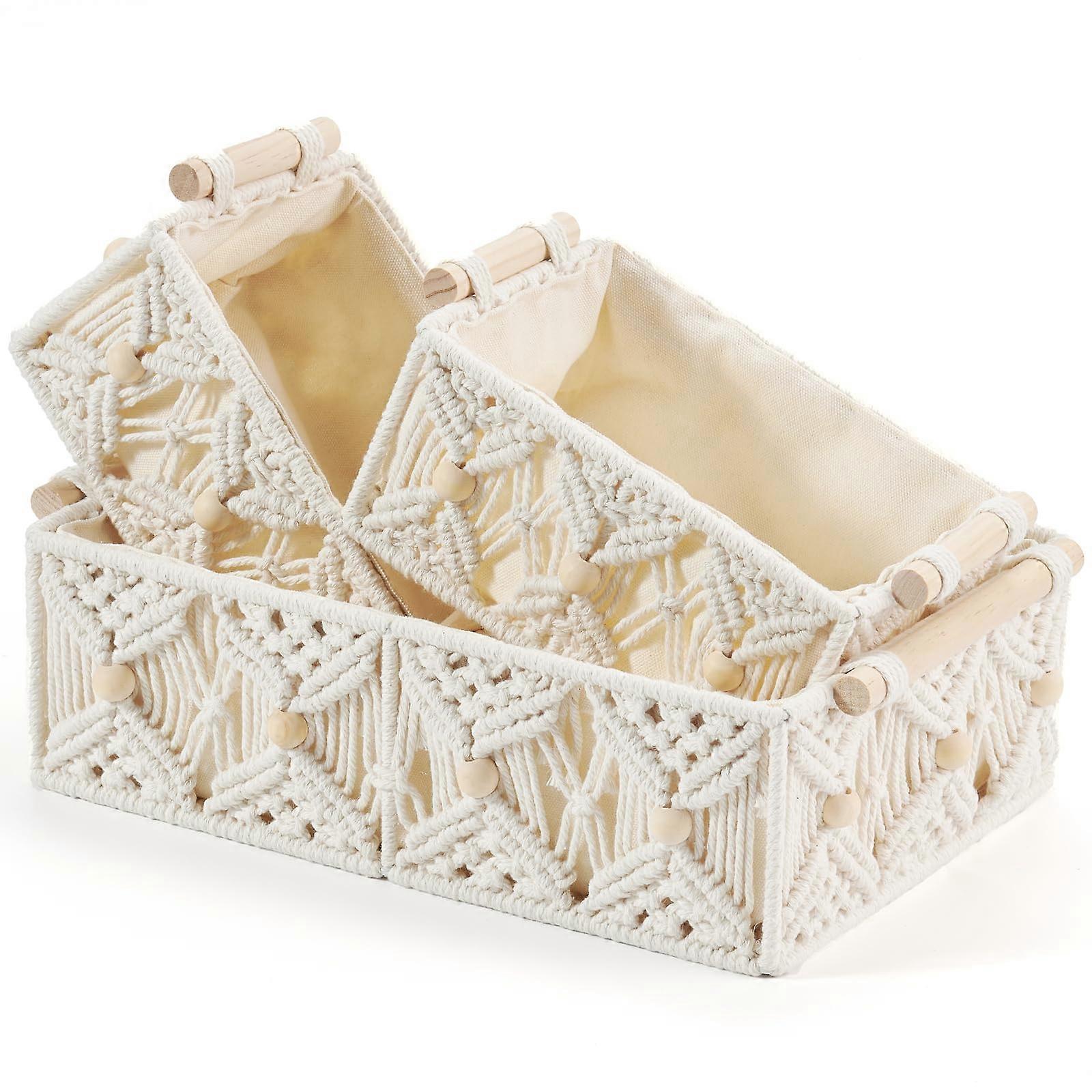 3 PCS Decorative Boho Handmade Bohemian Natural Cotton Rope Woven Storage Baskets Countertop Toilet Tank Shelf Organizer Off White with Wood Beads