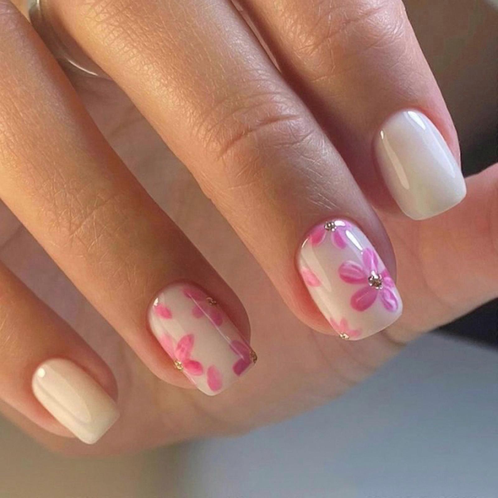 30 Pcs Short Square False Nail Pink Flowers Press On Nail Solid Color Acrylic Nail Glossy Full Cover Stick on Nail