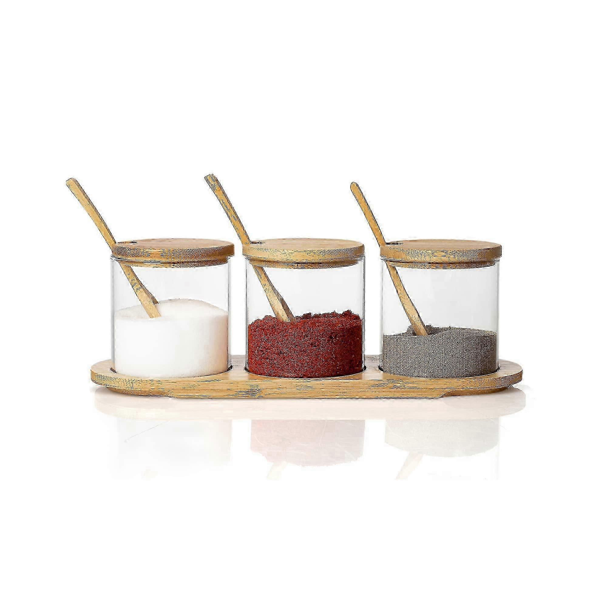 300ml Spice Jars with Spoon - Bamboo Lid & Base - Glass Jar Set for Herbs, Salt, Sugar