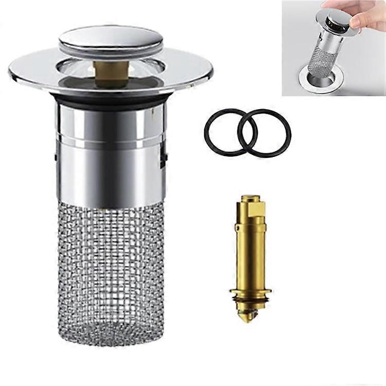Say Goodbye to Clogged Drains: Keep your bathroom sink clean and clog-free with our bathroom sink drain filter replacement. This pop-up drain hair catcher is designed to effectively trap hair and prevent it from clogging the drain High-Quality Materials: The stainless steel drain filter features a brass core construction for durability. Installation is easy, simply replace your old sink stopper with this new one. Cleaning is a breeze too; just remove the filter basket and rinse it under running water Pop-Up Design: The pop-up bathroom sink drain filter includes an anti-clog basket that combines a stopper and filter. It can store water and prevent hair and valuable items like jewelry rings from entering the drain. The removable extended basket provides extra space for collecting debris, making cleaning even easier Easy Installation: Tool-free installation means anyone can install the pop-up drain! Just remove the old stopper and insert our sink drain filter into the drain hole. No plumber or tools are needed. For cleaning, simply remove it and rinse under running water, using a soft brush or cloth to remove any stubborn debris. No more digging out hair and gunk to clear your drain Fits Various Sink Holes: This stainless steel drain filter fits 99% of sink holes, with an inner diameter range of 1.02 inches to 1.2 inches. It can be used in washbasins, bathroom sinks, and shower bathtubs. It comes with two sizes of rubber rings (34mm and 40mm) to ensure a snug fit for different drain sizes Specifications: Dimensions: Bottom Diameter: 1.18 inches, Top Diameter: 2.36 inches, Height: 3.15 inches Material: ABS + Brass Core + 304 Stainless Steel Filter Mesh