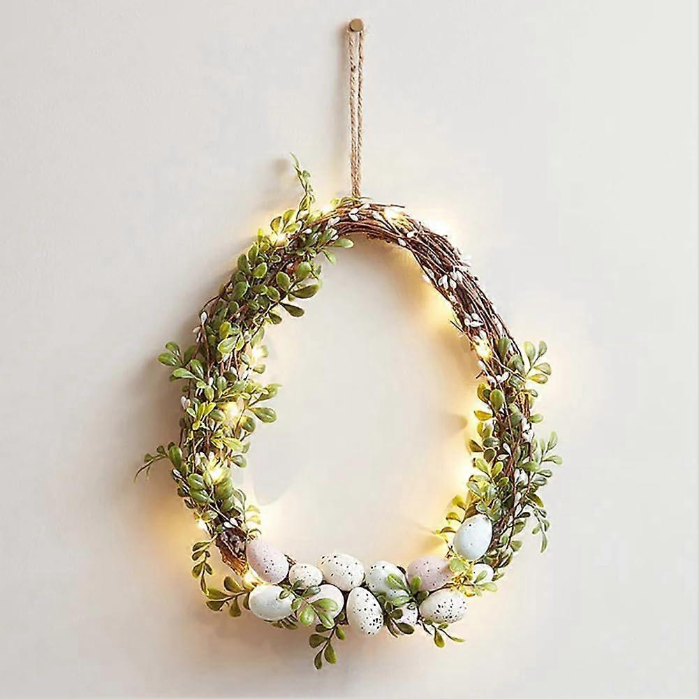 30cm Grapevine Wreath with LED Lights Battery Powered Light-Up Spring Wreath Easter Egg Wreath for Decoration Eggs and Green Leaves