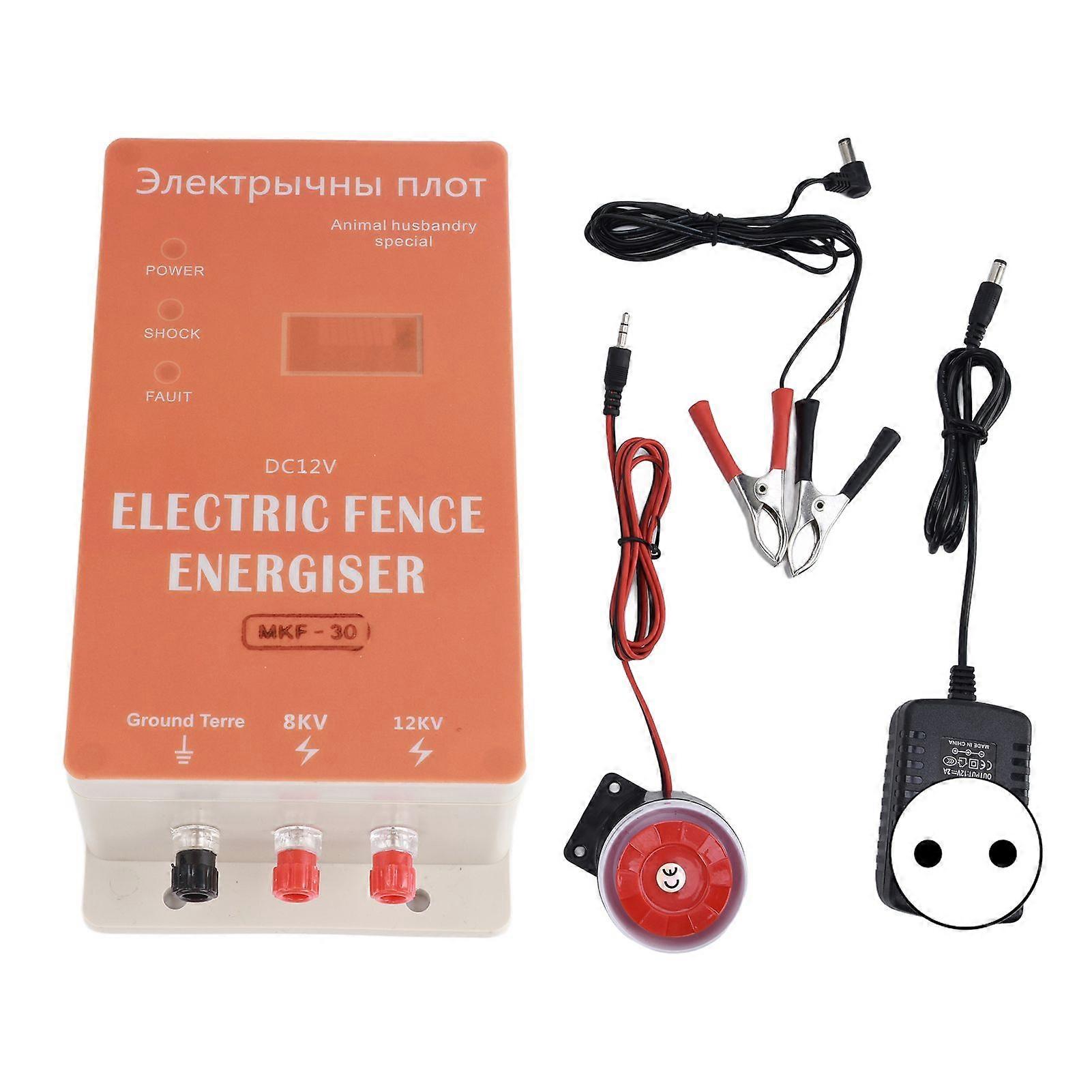 Features1[Indicator Light] Power indicator light of the main unit is on, indicating that the power supply is turned on, and the high voltage pulse indicator light is flashing when normal, and the fault light is on, the fence or the main unit is faulty. 2[Display Screen] Input voltage and power display instrument, real time display of the voltage and power of the power supply or battery, the machine will alarm when it is lower than 12V, stop working to protect the battery from over discharge. 3[Ground Terminal] High voltage positive 8KV output terminal, and the ground terminal to form 8KV high voltage pulse electricity, high voltage positive 12KV output terminal, and the ground terminal to form 12KV high voltage pulse electricity. 4[Multiple Power Supply Modes] DC and AC power can be switched, you can use the power adapter to supply power, you can also bring your own battery or solar power system to supply power. 5[With Alarm] When the fence fails, the alarm will sound a siren, the professional animal husbandry electronic fence can work sensitively in a large range without harm to people and animals, and can be used with confidence.SpecificationItem Type: Electric FenceMaterial: ABSProduct Size: Approx. 24 x 12 x 7.5cm / 9.4 x 4.7 x 3inBottom Hole Distance: Approx. 22 x 7cm / 8.7 x 2.8inWeight: Approx. 1388g/48.9ozInput Voltage: DC12VOutput Voltage: 8KV/12KVPulse Period: 0.75S-0.3SOutput Energy: 7 JouleAlarm: YesCable Length (The Longest Cable Distance): Approx. 30000m/98425.2ftVoltage: 100-240VSpecifications: 30KM Alarm HostType: High Voltage Pulse FenceUses: Animal Husbandry ProtectionApplicable Scene: OutdoorApplicable Animals: Pigs, Cows, Sheep, Horses, Pigs, Dogs and Other AnimalsThe working principle of the electric fence: The high voltage current generated by the electric fence pulse controller forms a loop through the wire, animal, earth, host.Electric fence use and benefits: Perhaps the most widely recognized method of animal control is the electric fence system. Electric fences not only control domestic animals and livestock, but also have many important uses, including confining wild animals Type groups of animals, allow crop and forage rotation, isolate animals from trees, rivers, roads and damaged land, electric fences have enabled newer grassland management techniques, better grassland management is better for pastoralists , Fixed and movable electric fences are used for grassland zoning to ensure the uniformity of grassland grazing and animals on the grassland; only in this way can the forage keep good palatability, as well as maintain the appropriate height of the grass, and ultimately play a role in Increase milk and meat production in grasslands.Function:(1) DC12V: 12V DC input socket, need to use 12V power supply of not less than 2A, you can also use the battery cable provided with the machine to directly use 12V battery power supply, if you use 220V AC power, you need to use a power converter (the machine is already equipped) , 220 AC power must be equipped with a leakage protector, or a small current leakage protector installed separately for the power converter of the machine. (2) Pulse adjustment: The pulse cycle adjustment knob, rotate this knob to adjust the pulse to form a discharge cycle between 0.75 seconds and 0.3 seconds.(3) Alarm: Alarm output socket, output 12V when alarming, used to connect alarms with power less than 10W, if you need to connect alarms larger than 10W, you need to connect an external relay control power supply to supply power to the alarms, and directly connect an alarm larger than 10W. The alarm will burn out the wiring inside.Package List1 x Electric Fence 1 x Power Adapter 1 x Pair of Battery Clip 1 x Alarm 1 x English Manual