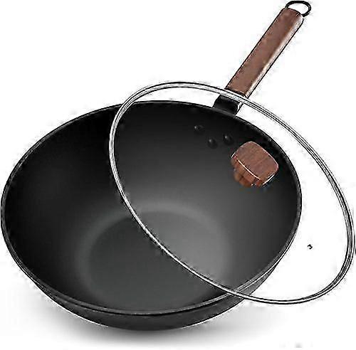 33cm Carbon Steel Wok Pan with glass Lid Woks & Stir-Fry Pans No ChemicalFeature: PRE-SEASONED & NONSTICK: Carbon steel is the best wok material because it has a natural nonstick surface once seasoned. Our carbon steel wok is no chemical coating and is pre-seasoned at high temperatures over 1000F using nitrogen treatment for excellent wear resistance, fatigue resistance, corrosion resistance and high temperature resistance. GENUINE TASTE: Our large wok pan reacts quickly to heat adjustments and is specially designed to lock the juice and flavor inside the ingredients. With its greater curve and higher walls, heat is less concentrated on the flat bottom and better distributed up the walls. The high curvature results in a broader base for maximum area of heat transfer, allowing the burner flames to visibly hug the pow wok. VERSATILITY: Flat-bottomed wok is better suited for home use because it does not require a wok ring to sit well on any stovetop such as electric stoves, induction stoves, gas stoves, and other heat sources. In addition to stir-frying, with the cooking wok, you can cook healthy meals using various traditional cooking techniques like pan-frying, braising, and deep-frying. COMFORTABLE HANDLE: The ergonomic design of the wooden handle ensures a comfortable grip and protection against burns. The wok body weighs 2kg and is 33cm wide and 9cm deep, and can serve at least 3-6 people food portions, which is ideal for the whole family or small gatherings. specification: Material: Carbon Steel Special Feature: Non Stick Color: Black Capacity: 5.6 L Compatible Devices: Smooth Surface Induction, Gas