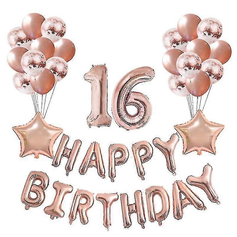 - 37 pieces all together, including 13 pieces 16-inch rose gold aluminum HAPPY BIRTHDAY letter balloons, 2 pieces 16-inch digital rose gold aluminum balloons, 10 12-inch rose gold latex balloons, 10 12-inch rose gold sequin balloons and 2 18 Inch five-pointed star rose gold aluminum balloons.