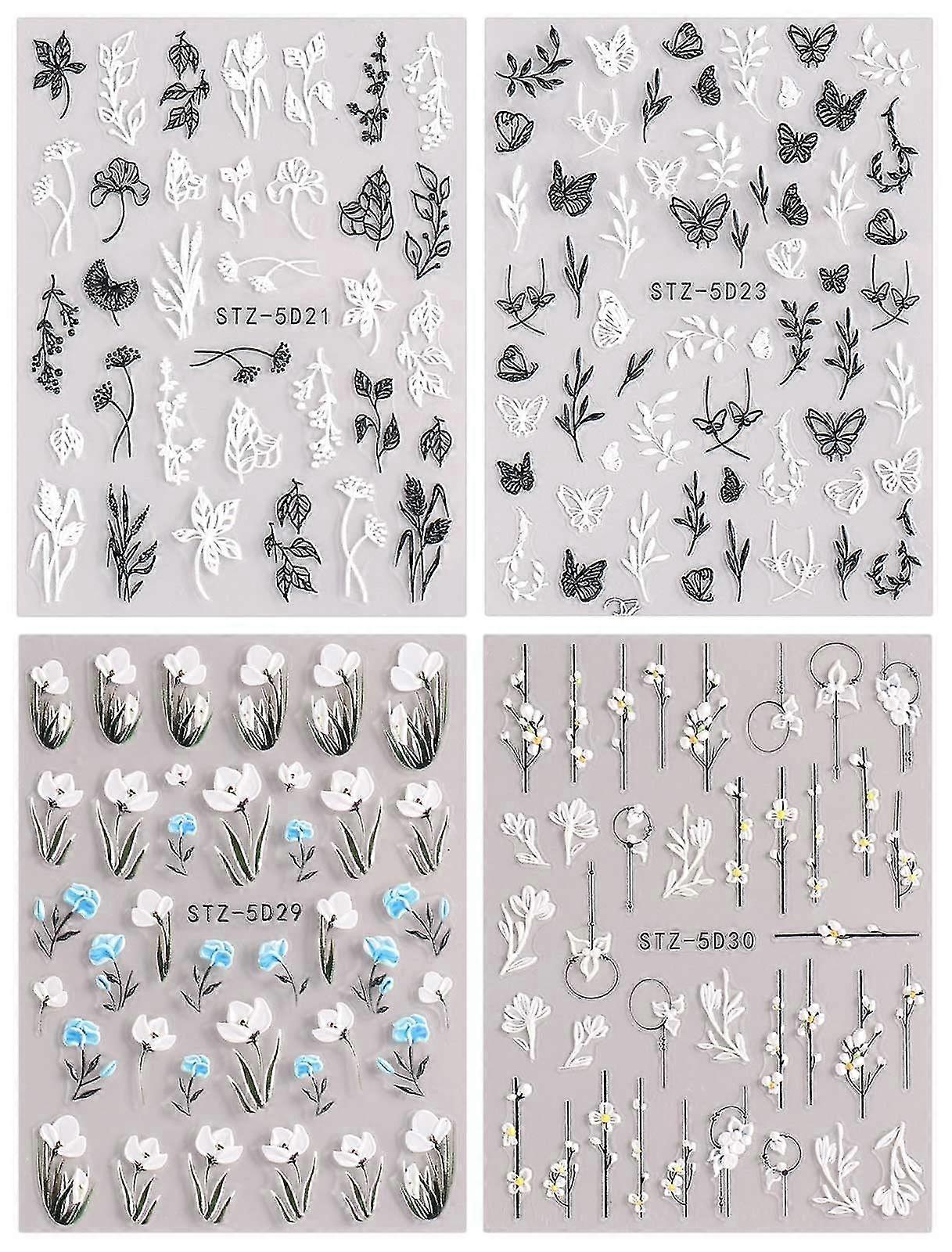 3D Embossed Flower Spring Nail Art Stickers Decals Self-Adhesive 5D Summer Colorful Floral Nail Supplies Decoration Accessories 4 Sheets