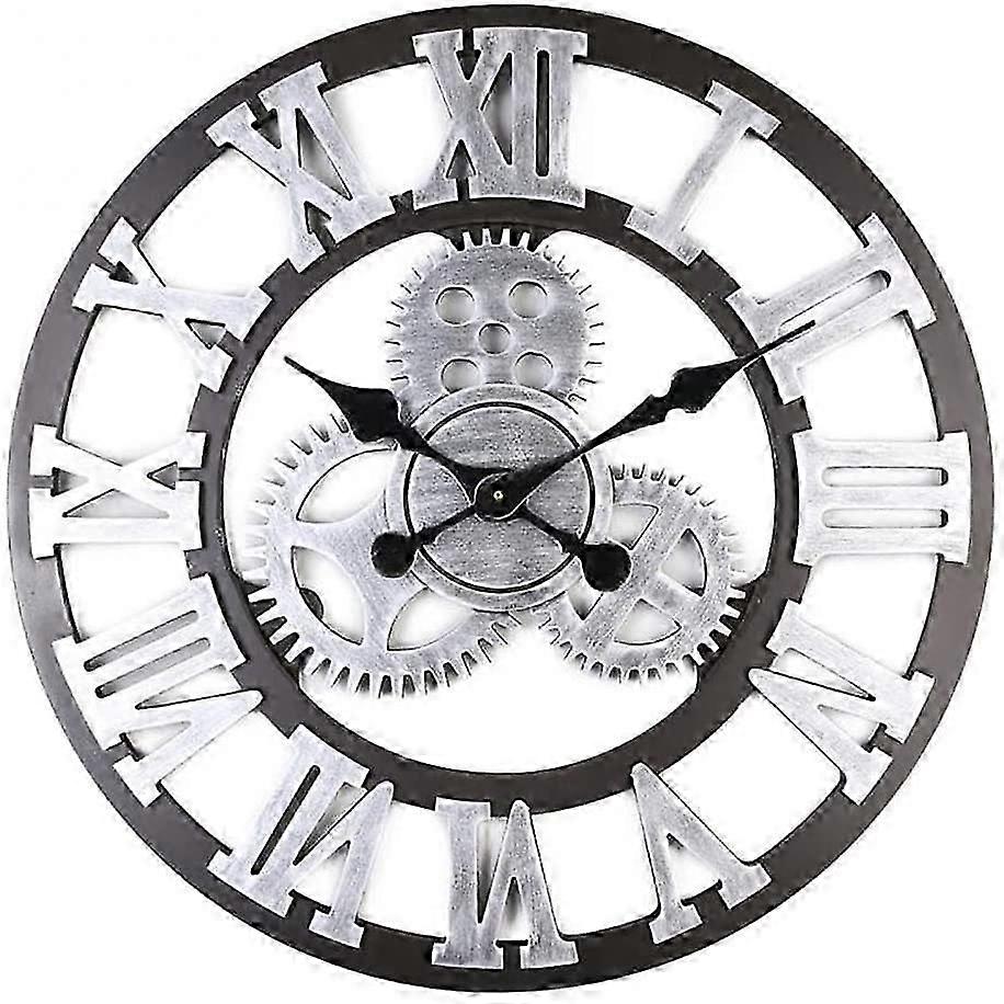 3D Large Classic Vintage Wooden Silent Wall Clock Retro Gear Hanging Clock Roman Numeral Horologes European Style Steampunk ,Silver,40 * 40cm