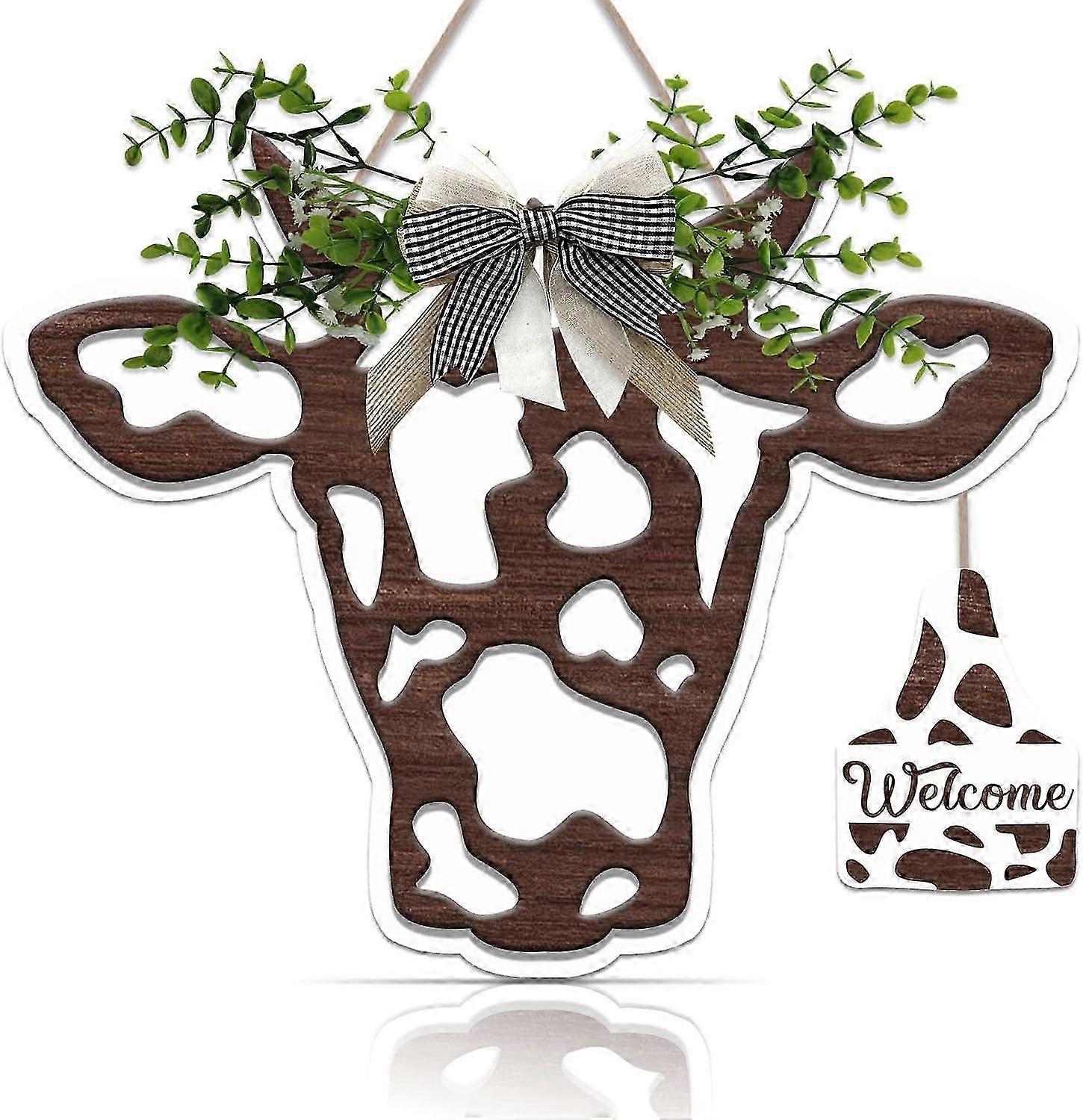 3D Cow Head Wreath Wooden Sign, Outdoor Cow Welcome Door Hanger Sign, Animal with Bow and Artificial Leaves Hanger for Front Door Porch Farmhouse Dcor