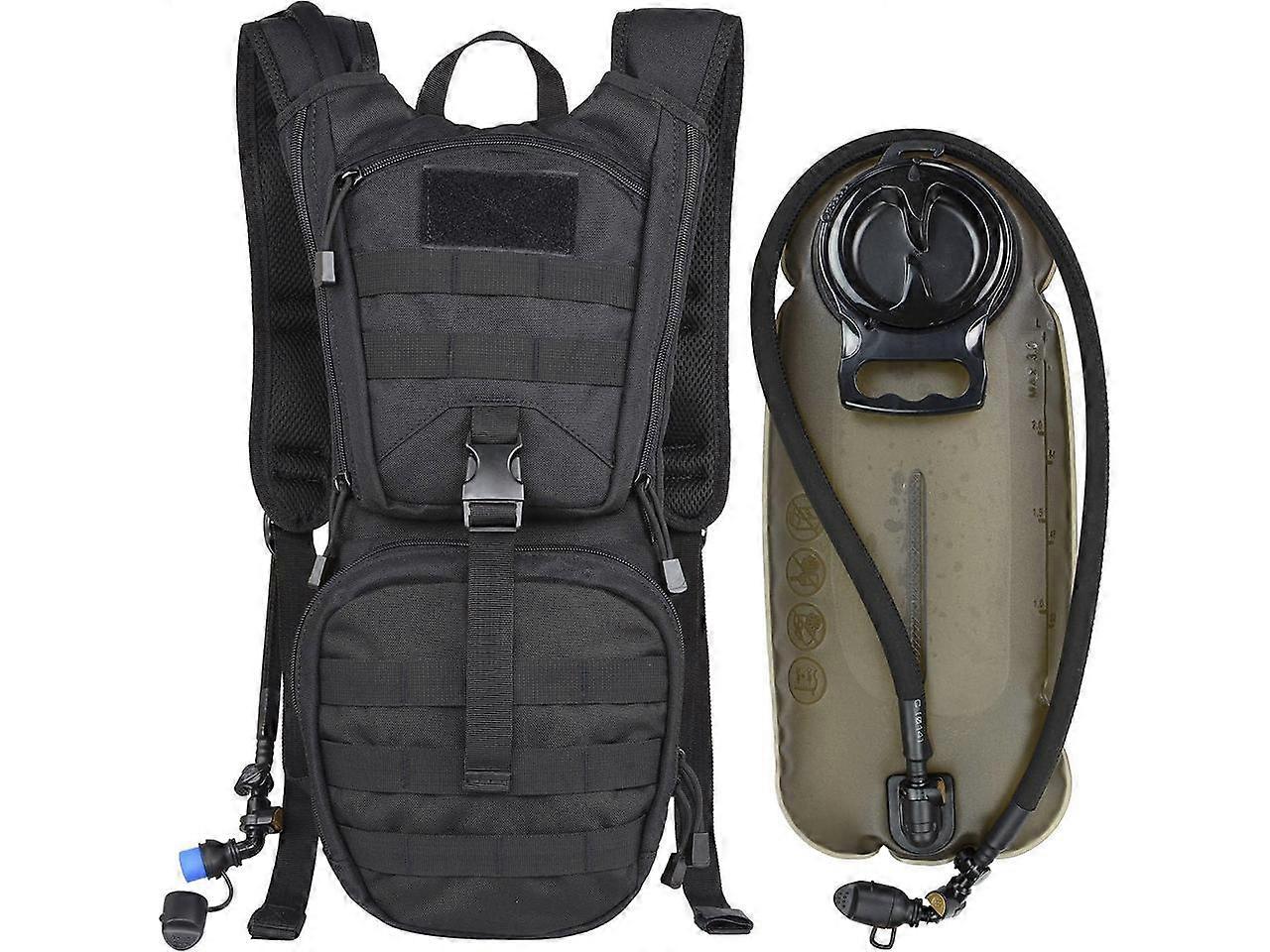 Features: Streamlined and Compact Design: 19.7”x8.7”x2.6” in size. Ergonomically fits for your shoulders, chest, and waist. 3 straps are all adjustable for reducing bounce. Soft air mesh back speeds up air-flow and makes your back cool. Foam padded shoulder straps are extremely comfortable. Reliable Material: Heavy duty 1000 Denier water repellent nylon with superior wear resistance. Engineering plastic buckle is durable and impact resistant; Military grade webbing is strong, anti fading; SBS brand zipper is reliable and long lasting. Practical Functions: 1 main pocket fits up to 3L water reservoir with either large or small opening. 2 external pockets for storing personal belongings wallet, gadget, towel, phone, keys. The MOLLE system allows you to carry more items. Professional 3L Hydration Bladder: Made of 100% BPA free, tasteless TPU. Quick release valve allows you to refill water without connecting hose. Large opening is easy to clean and add ice cube. 360 degrees rotatable mouthpiece allows for easy drinking. Shut On/Off valve helps to adjust water flow. Middle baffle keeps the bladder flat and makes it easier to place into the backpack. Versatility: Frees your hands while drinking, this tactical hydration pack is your perfect choice for short trip, camping, bike riding, walking, mountaineering, kayaking, skiing, snowboarding. A decent Holiday Gift for families and friends who love outdoor sports. Cleaning: Before the first use, fill the bladder with dish soap or baking soda and warm water, run the liquid through the tube and mouthpiece, let them sit for 2 hours and then pour out the liquid. Rinse them all several times with only water and let them air dry. Storage: Empty the water, rinse clean and make sure it is completely dry before storing. Uniqueness of Tactical Hydration Backpack: Cloth, buckle, zipper and webbing are all made from the high-grade material, sturdy and durable. Cloth is water resistant to secure your gears inside. Main pocket can hold either large or small opening water bladder, compatible with most of bladders on the market. Two external pockets are used to place personal items T-shirt, toiletries etc. The MOLLE suspension system expands to attach more items. Shoulder, chest and waist straps can all be adjusted to your comfortable size, keep the pack snug to your back. Three breathable mesh pads at the backside make rapid air flow, while even the weight to your back for ultra relaxed carrying. Well-designed Leak Proof 3L Hydration Reservoir: Quick Release Valve: No longer need to hold the long hose to fill water, just detach the hose to fill water easily. Both reservoir and thermal insulated hose are made from TPU that is cleaner and more resistant to bending than ordinary PVC material. With Large 9 cm diameter water inlet, easy to clean, fill water and add ice cube. Mouthpiece is 360 degrees rotatable to drink easily. With middle baffle keeps the bladder flat and makes it easier to place into the knapsack. Stylish and Sleek Appearance Ergonomic design provides extra body hugging comfort and eliminates bounce and movement. Fits for 27 to 50 inches chest. It will last years of use. Multi Occasion Use Not only does it carry water, but also store your essential items, ideal for a day excursion and sports that you need to focus attention. Your Satisfaction is All for us Take our tactical water pack with your next adventures, we will be with you to enjoy the wonderful outdoor sports!