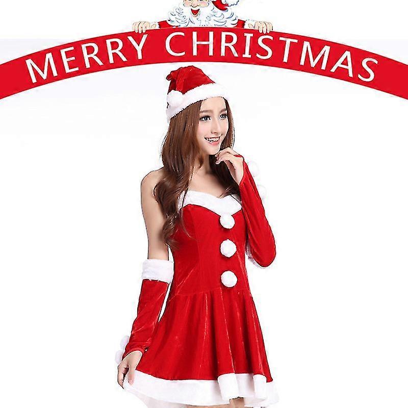 3pcs Santa Claus Costume Womens Santa Suit Christmas Fancy Dress Costume With Dress, Hat, A Pair Of Gloves One Size 3 White Pom Pom