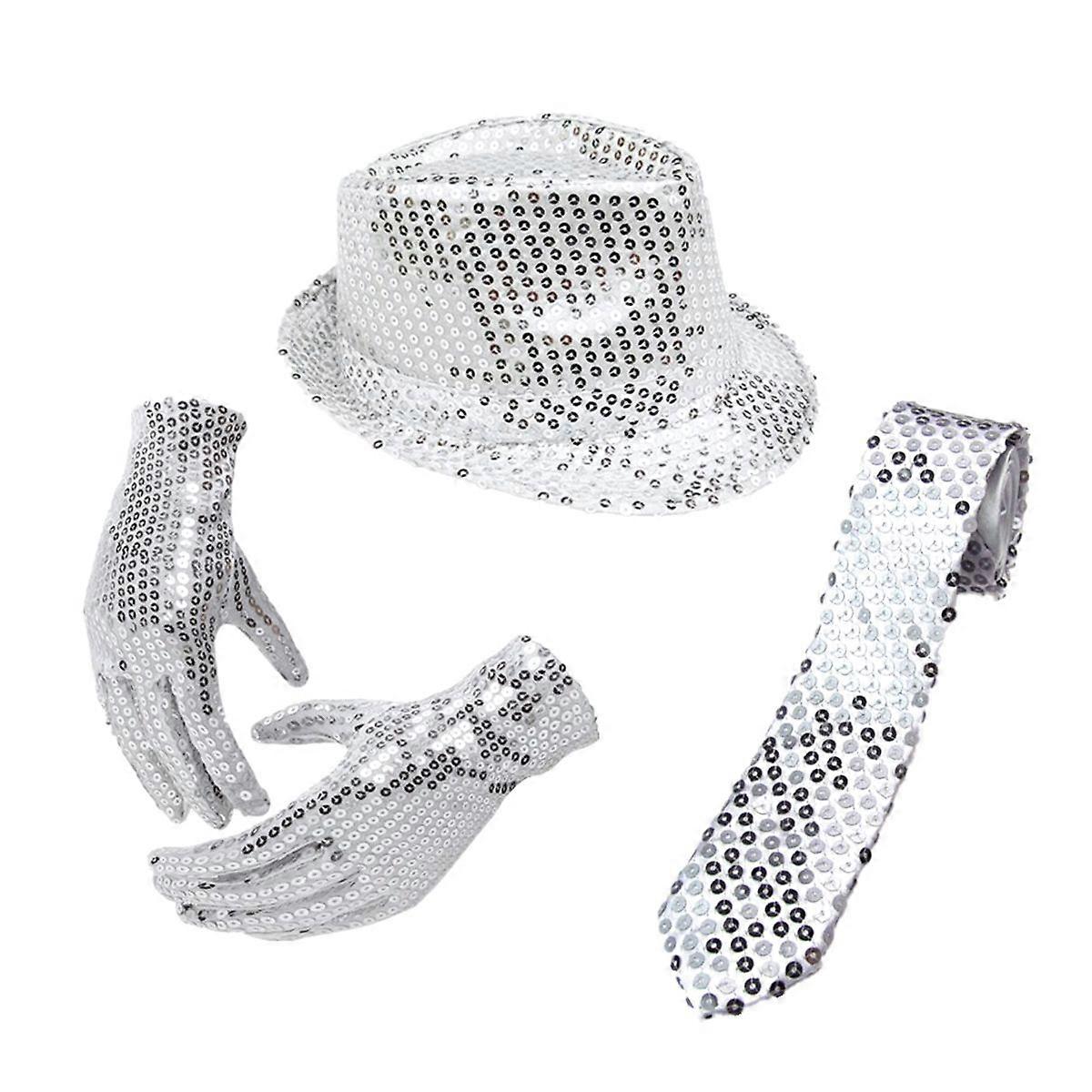 3pcs Jazz Dance Performance Accessories Sets Beautiful Shining Costume Sets for Dance Party Festival (Silver Hat Size M, Tie, Glove Size M)