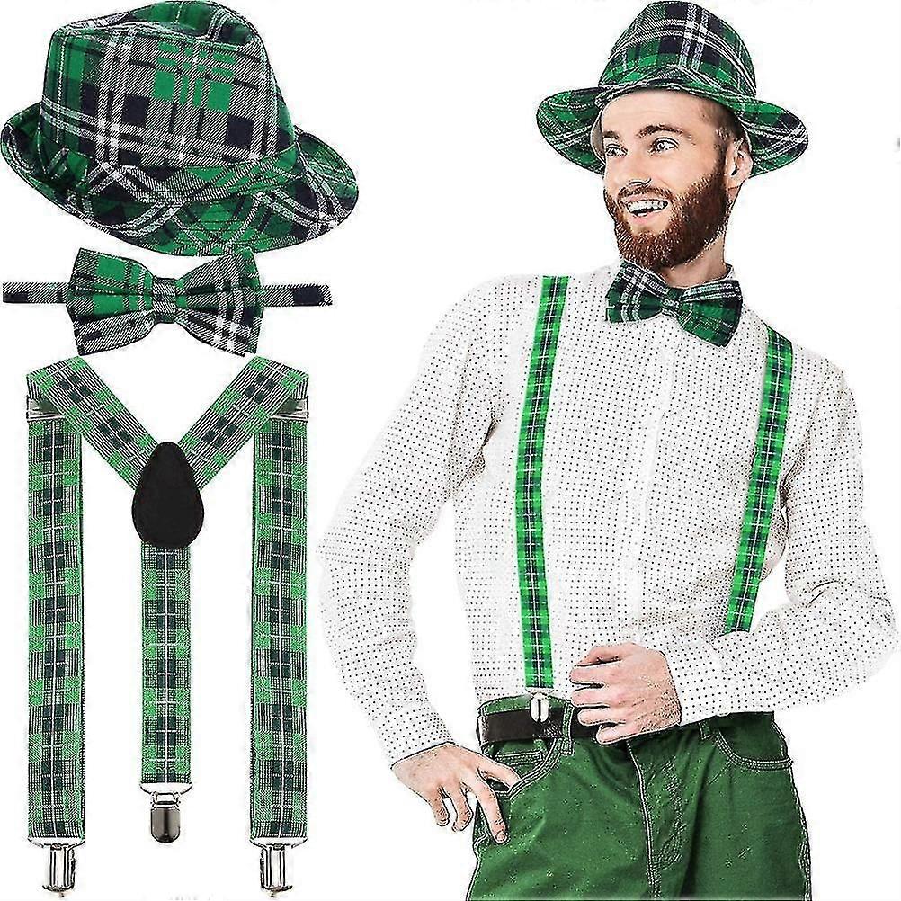 3pcs St Patrick's Day Hat Green Checked Fabric Fedora Hat Bow Tie And Braces St Patrick S' Day Costumes Accessories fg2025031701358