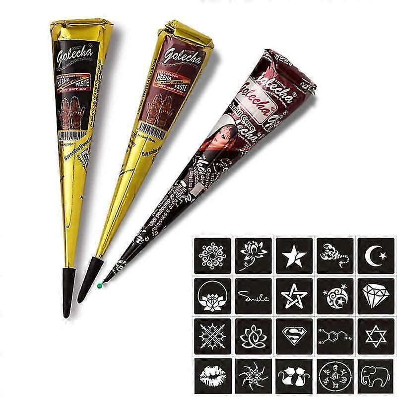 3pcs Fresh High Quality Dark Brown Natural Henna Mehndi Cone Temporary Tattoo With Template