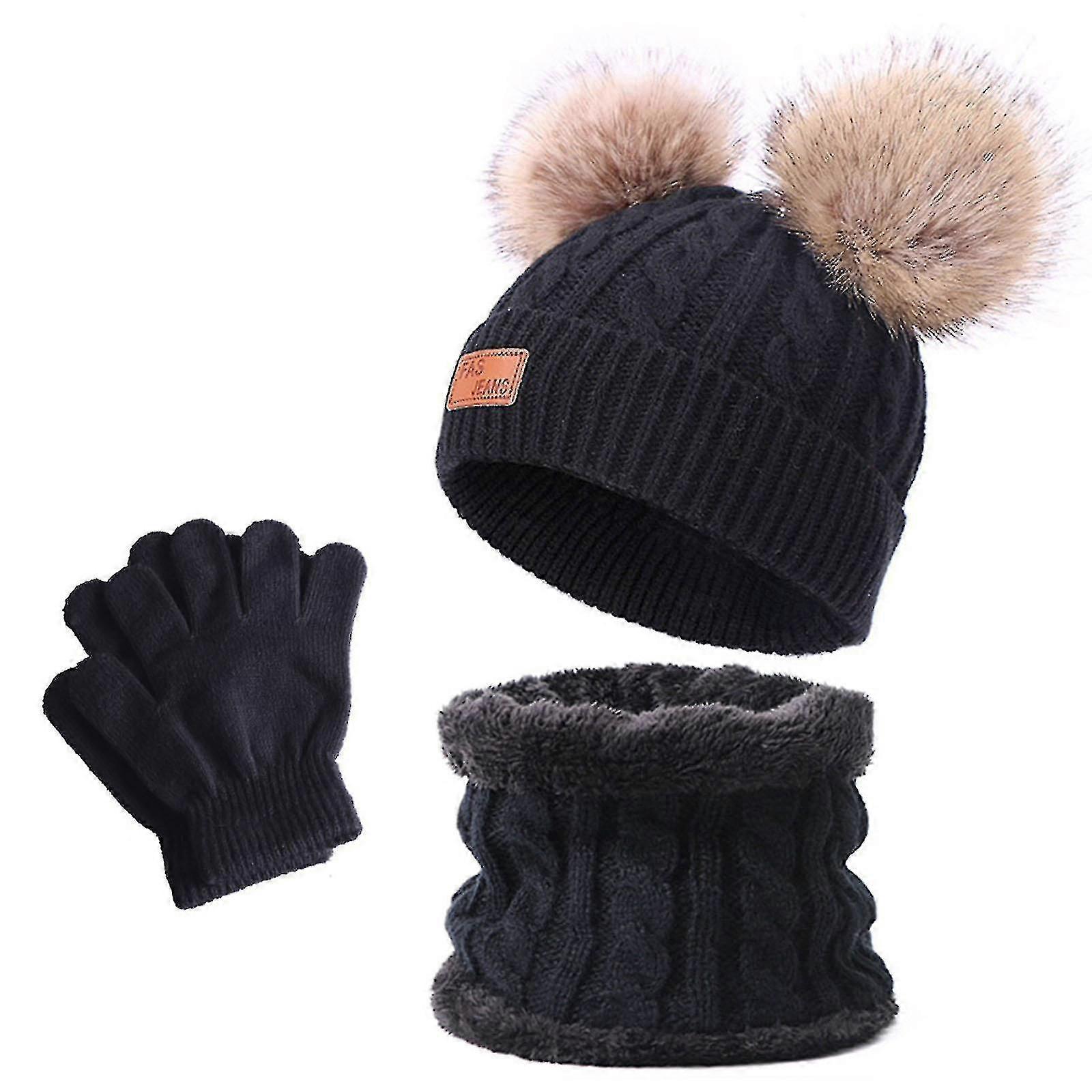 3pcs Winter Kids Hat Scarf And Gloves Thick Pompom Fleece Lining Knitted Thermal Sets For Children Holiday