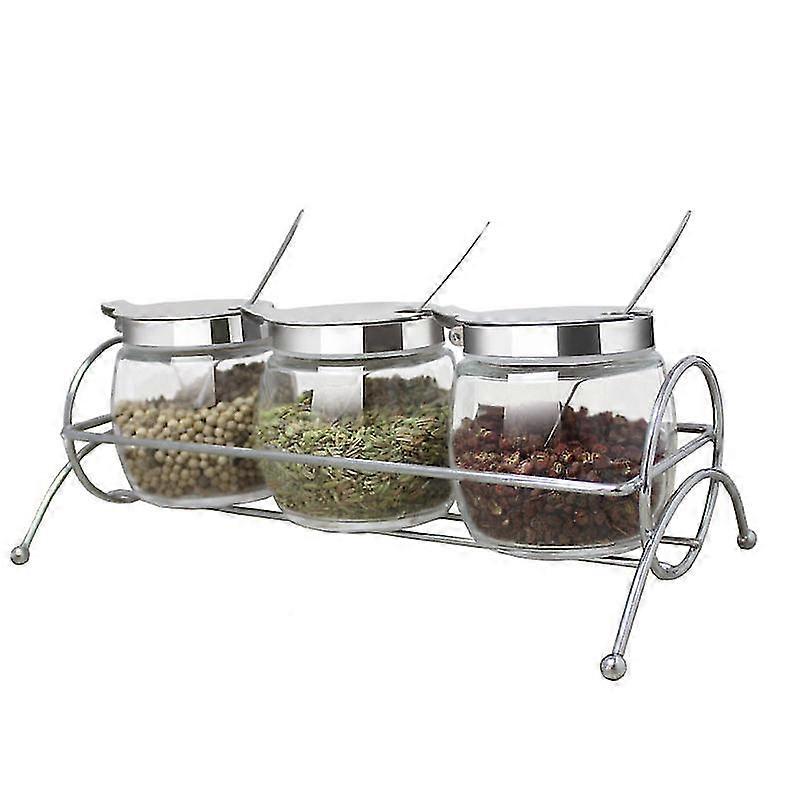 Three Condiment Containers in one Delicate Base Shelf. You Can Place This Set in kitchen Counter or Dining Table. Tidy & Elegant! Clear Glass Body for Better Recognition. You Can Find Out Your Favorite Three Seasonings at a Glance! Attentive Design-- Flip Cover, Easy to Open; Lengthen the Spoon, Convenient to Take Spices. Capacity: 200ml/ 7.4oz; suit for various seasoning like Sugar, Salt, Pepper, Spice, etc. Just Enjoy delicious Food!iron galvanized shelf - anti- protective layer design, stable Specification: Colour:Silver + Transparent Material:Stainless steel + glass Size:27x14x12cm Package Contents: 3 * Condiment Spice Container 3 * Spoons 1 * Base shelf Only the above package content, other products are not included. Note: Light and different displays may cause the color of the item in the picture a little different from the real thing. The measurement allowed error is +/- 1-3cm.