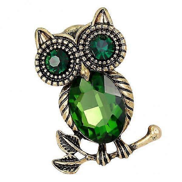 3xLeaf Branch Perched Owl Brooch Pin Crystal Breastpin Rhinestones Green