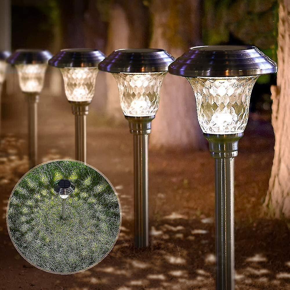 Stainless Steel and Glass: This cordless solar light comes with glass and stainless steel lenses. Glass lenses have better light transmission than plastics. The diamond Waterproof reflects more light at night. During the day, sunlight shines brightly. through the pure glass, adding a beauty elegant to your garden instead of cheap plastic. The stainless steel ensures that the product can be used in all weathers.^Easy to clean. install: use out of the box, easy to install install, then insert it into the ground, you can use it. No other tools or wires are needed. The height of the solar garden path light is 11.9cm x 41.9cm.^Auto/Attached Power and Warm White Decoration: Solar car lights use solar panels, which can absorb sunlight, convert sunlight into electricity; and charge AA Ni-MH batteries (included). Work entirely at home. solar energy. At nightfall, it goes out at night. dawn^Efficient and environmentally friendly: 6 lumens solar powered, solar ground light with warm white LED. The diamond-shaped LED light of this decorative outdoor solar lamp is powered by a solar panel (located on the top of the lampshade), which can emit light ;re which lasts from 8 to 12 hours (no additional electricity is required); 100% solar energy. The white LED solar light is on all night, until the morning.^All weather and light: the product consists of a stainless steel body, a glass lid and of a sturdy ABS plastic stake. , reasonable structure and long service life. Whether it's yard lighting or road lighting, it's perfect.